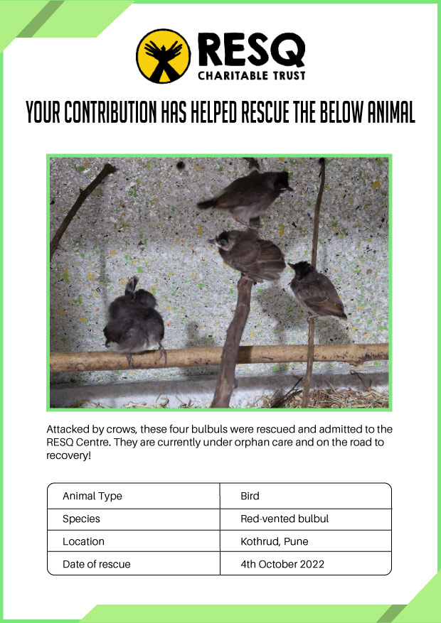 RESQ was founded in 2007 to provide emergency aid to animals in distress. Since then, the rescue and rehabilitation work of the organisation has provided aid to thousands of animals of over 200+ species, improved public health and safety outcomes, and actively worked on preventing human-animal conflict across multiple urban and rural ecosystems.