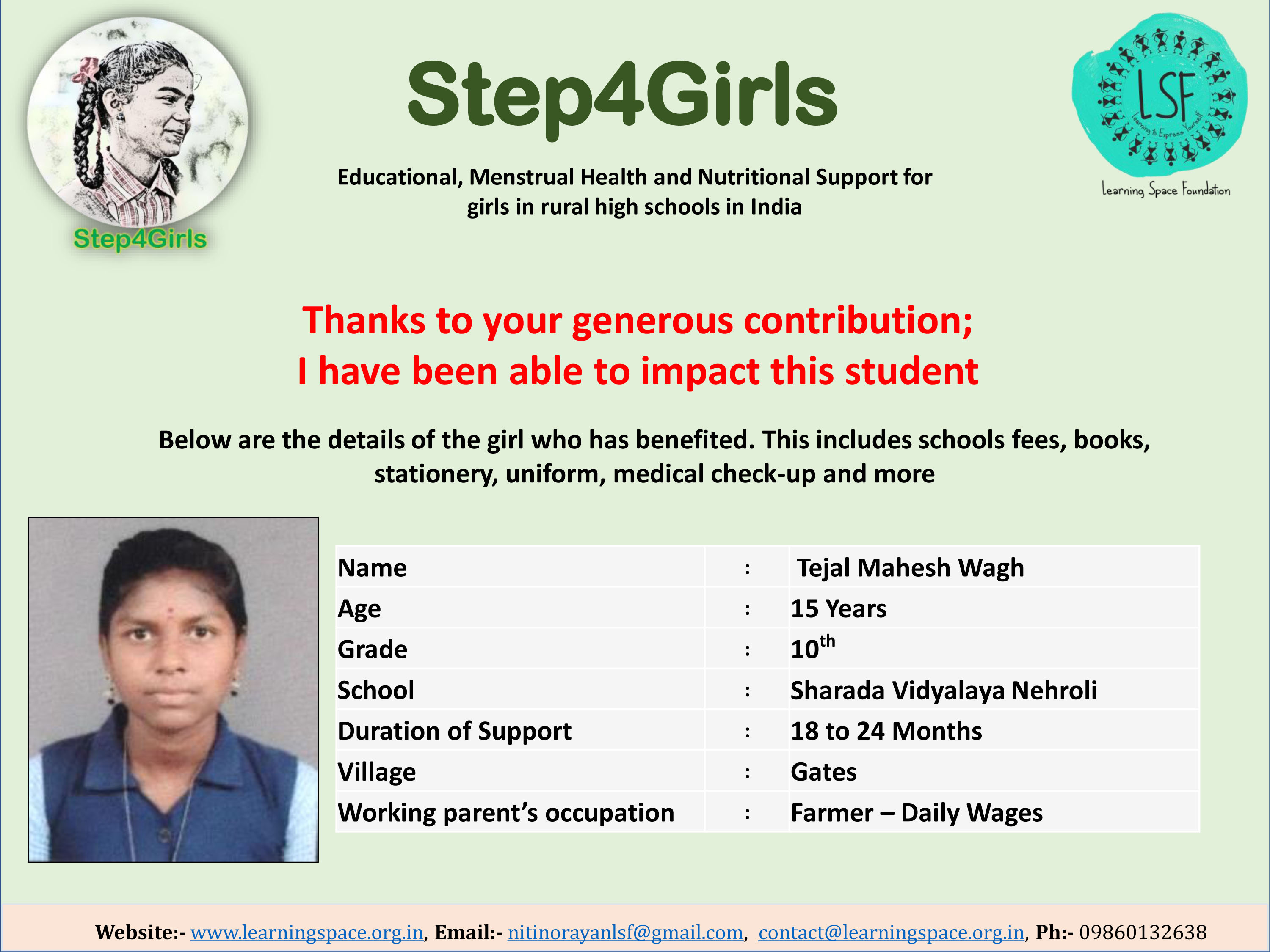 I was thrilled to learn about this initiative that provides education to underprivileged girls in Palghar and Thane districts. This will help them continue their education and achieve their dreams. Just INR 12000 will support their education for an entire year.