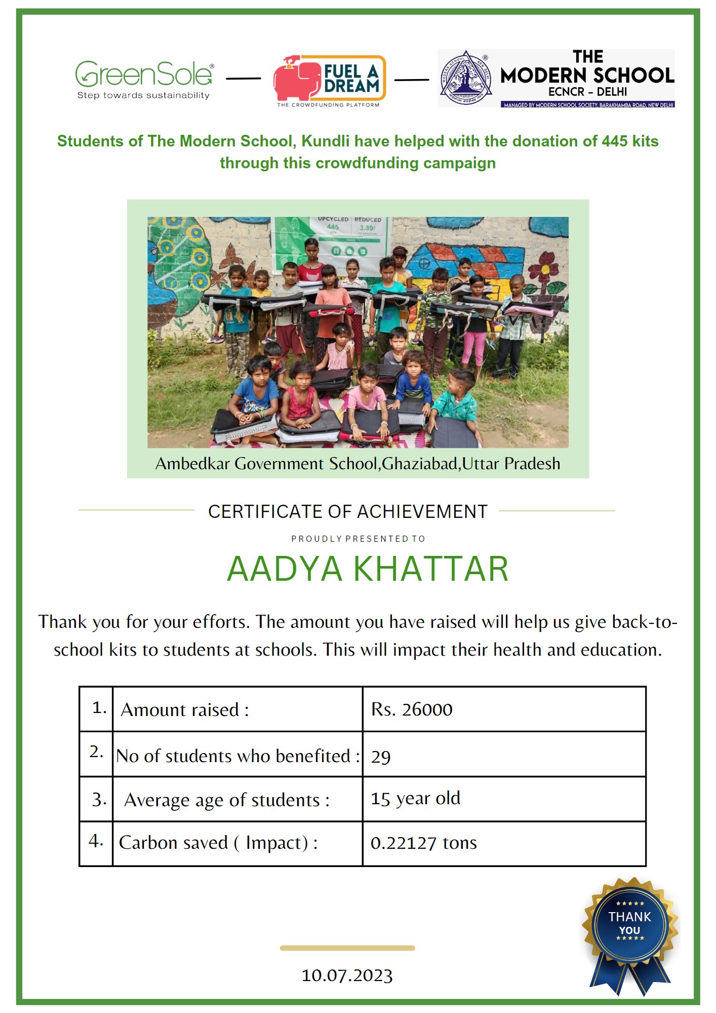 I have undertaken this campaign because I was surprised to learn that many students from low-income homes in Uttar Pradesh who go to school do not have basic school gear like proper footwear or a school bag and often sit on the hard ground in order to study at school.