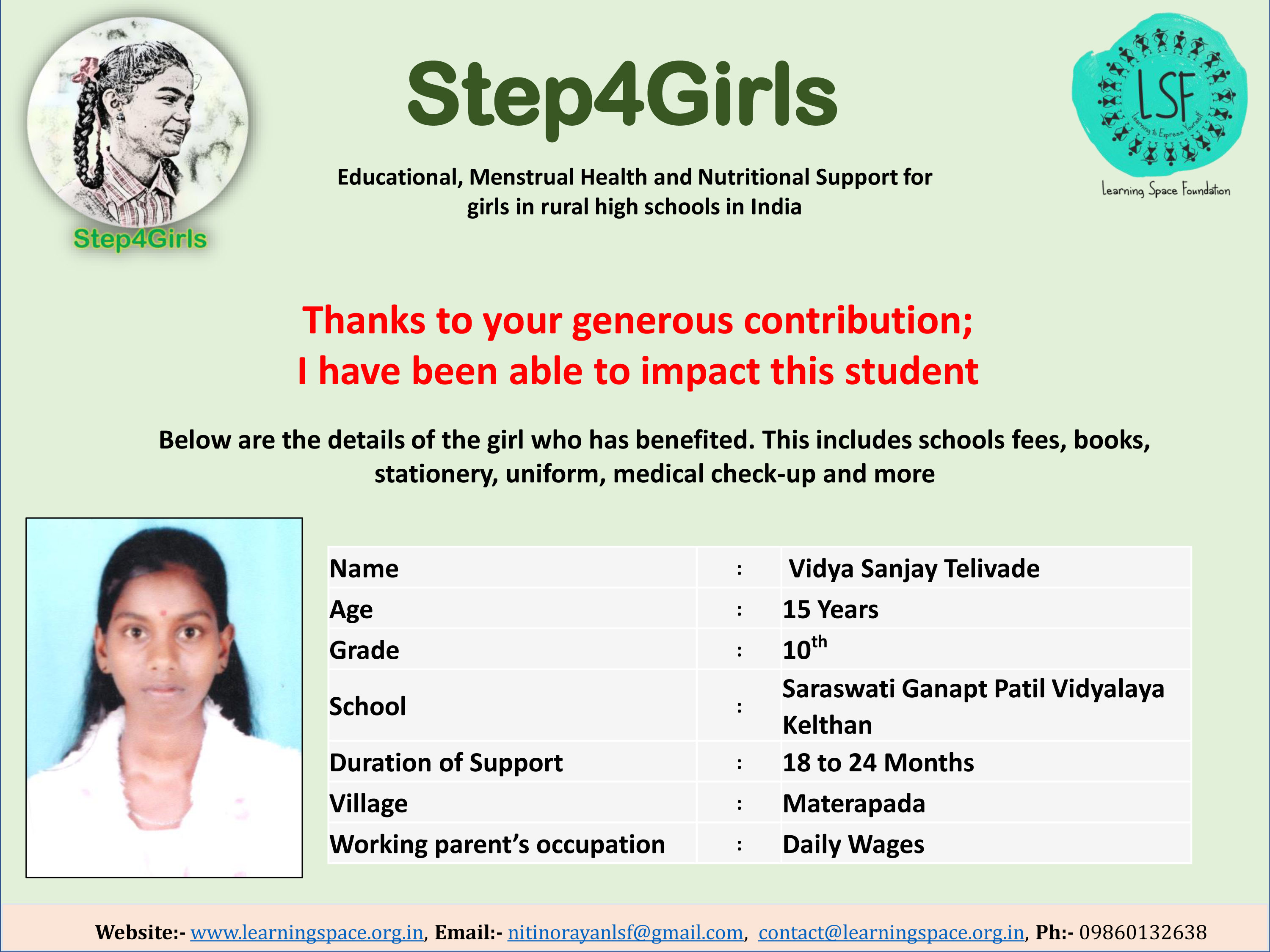 I was thrilled to learn about this initiative that provides education to underprivileged girls in Palghar and Thane districts. This will help them continue their education and achieve their dreams. Just INR 12000 will support their education for an entire year.