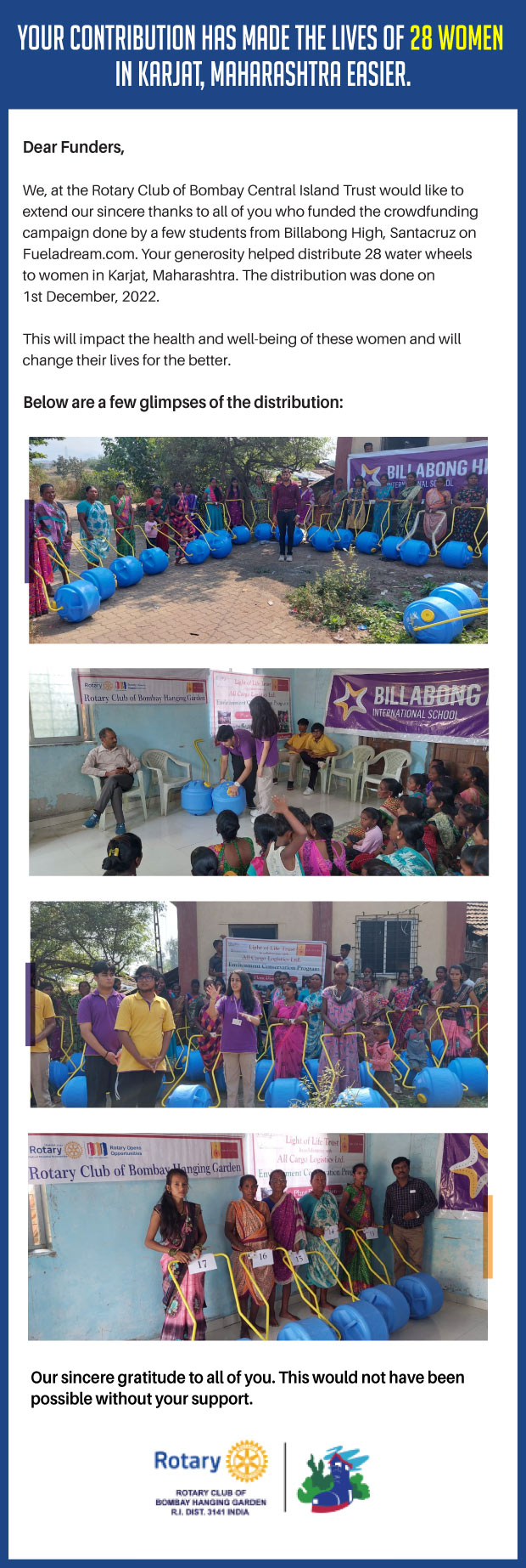 Please support my campaign and let us together bring joy to more women in Karjat. The Water wheels will be distributed by the team from the Rotary Club of Hanging Gardens with their local partners. The cost of doing this (including identifying the women, the cost of the water wheel, and the actual distribution) is only INR 3000 per water wheel making it truly a revolutionary idea.