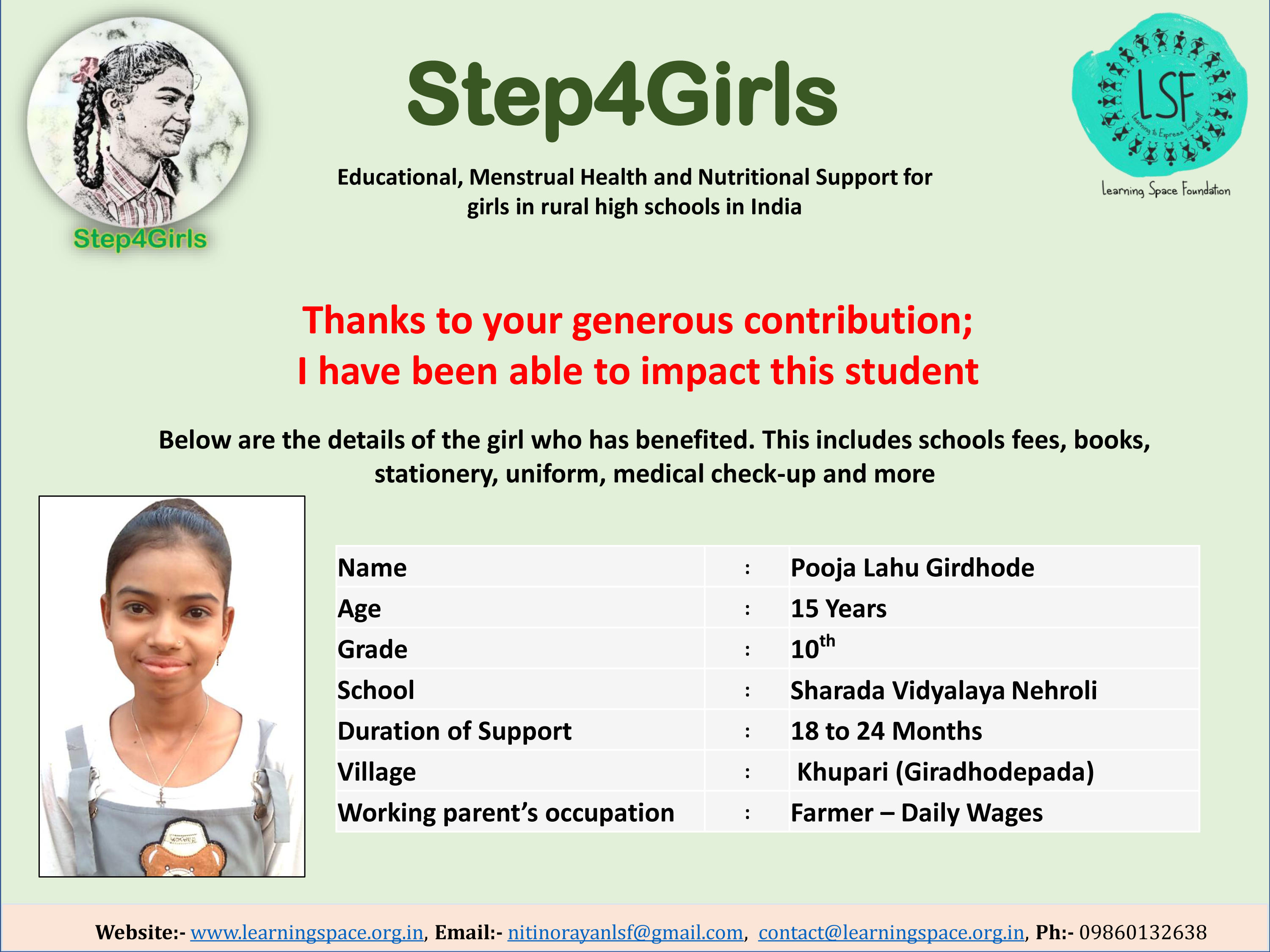 I was thrilled to learn about this initiative that provides education to underprivileged girls in Palghar and Thane districts. This will help them continue their education and achieve their dreams. Just INR 12000 will support their education for an entire year.