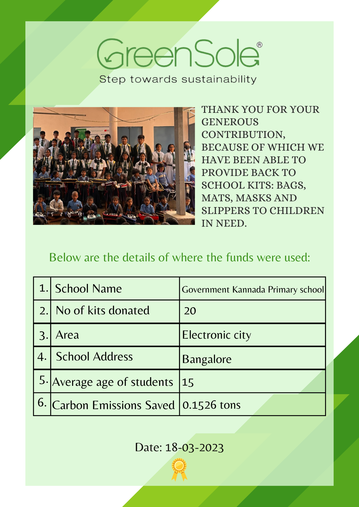 The distribution will take place in schools across Karnataka. NGO - Greensole is located in Navi Mumbai, Maharashtra.