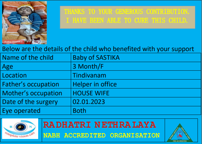 Project Balanethra is an initiative of the Radhatri Nethralaya Hospital in Chennai under the aegis of its public charitable trust Gurupriya Vision Research Foundation. This initiative aims to ensure that no baby loses his/her vision due to a lack of funds to do an ROP surgery.