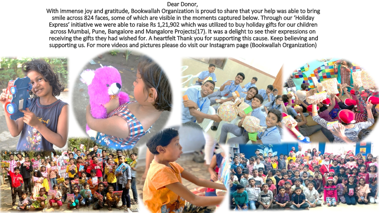 I am undertaking this campaign because I am deeply moved by the value-added services Bookwallah brings to the lives of traumatized children. This helps them to rebuild their lives, rekindling hope, love, and a promise of a better future. Through this holiday express initiative, I aim to bring joy to children living in orphanages. Just INR 3500 will impact 10 kids.