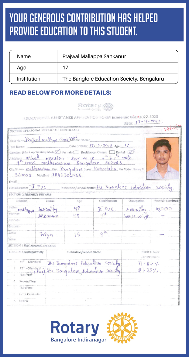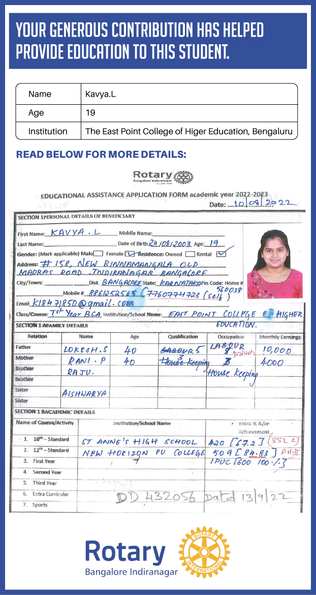 To ensure that there is complete transparency, the team at ROTARY BANGALORE INDIRANAGAR will post feedback about 2-3 months after the campaign gets over telling us which student has got the scholarship. This takes some time as they need to screen candidates and allocate them to me. The details will then be posted in the UPDATES section of my campaign and will be in a format like the one below. As soon as I post an update the platform will send an EMAIL alert to you. Click on the link and you can read about which child has benefitted. That's transparent right?