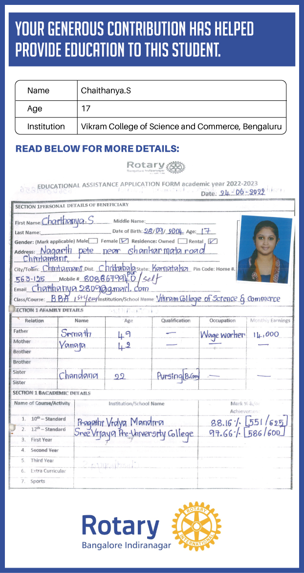 To ensure that there is complete transparency, the team at ROTARY BANGALORE INDIRANAGAR will post feedback about 2-3 months after the campaign gets over telling us which student has got the scholarship. This takes some time as they need to screen candidates and allocate them to me. The details will then be posted in the UPDATES section of my campaign and will be in a format like the one below. As soon as I post an update the platform will send an EMAIL alert to you. Click on the link and you can read about which child has benefitted. That's transparent right?