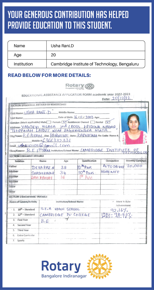 To ensure that there is complete transparency, the team at ROTARY BANGALORE INDIRANAGAR will post feedback about 2-3 months after the campaign gets over telling us which student has got the scholarship. This takes some time as they need to screen candidates and allocate them to me. The details will then be posted in the UPDATES section of my campaign and will be in a format like the one below. As soon as I post an update the platform will send an EMAIL alert to you. Click on the link and you can read about which child has benefitted. That's transparent right?
