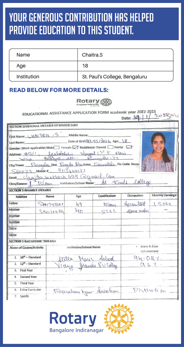 To ensure that there is complete transparency, the team at ROTARY BANGALORE INDIRANAGAR will post feedback about 2-3 months after the campaign gets over telling us which student has got the scholarship. This takes some time as they need to screen candidates and allocate them to me. The details will then be posted in the UPDATES section of my campaign and will be in a format like the one below. As soon as I post an update the platform will send an EMAIL alert to you. Click on the link and you can read about which child has benefitted. That's transparent right?