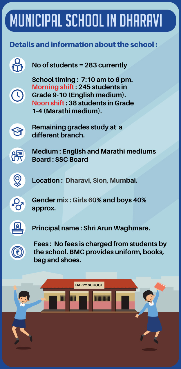 There is a municipal school in the slum of DHARAVI ( Asia’s largest slum) at SION, MUMBAI which is in a very dilapidated and poor state. This school caters to about 300 students of Grades 1 to 9 (280 currently) who come from nearby areas. It’s an English and Marathi medium school.