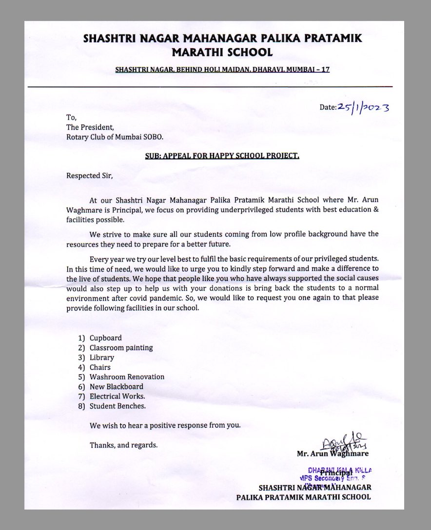 To address the problem, the Rotary Club of Mumbai SOBO is focusing on transforming the MPPM school in Shastri Nagar, located in the Dharavi slum area - in Mumbai, into a “HAPPY SCHOOL” by renovating it. The aim is to transform the school building and infrastructure, which is in a very vulnerable state into a secure, attractive, and happy learning place.