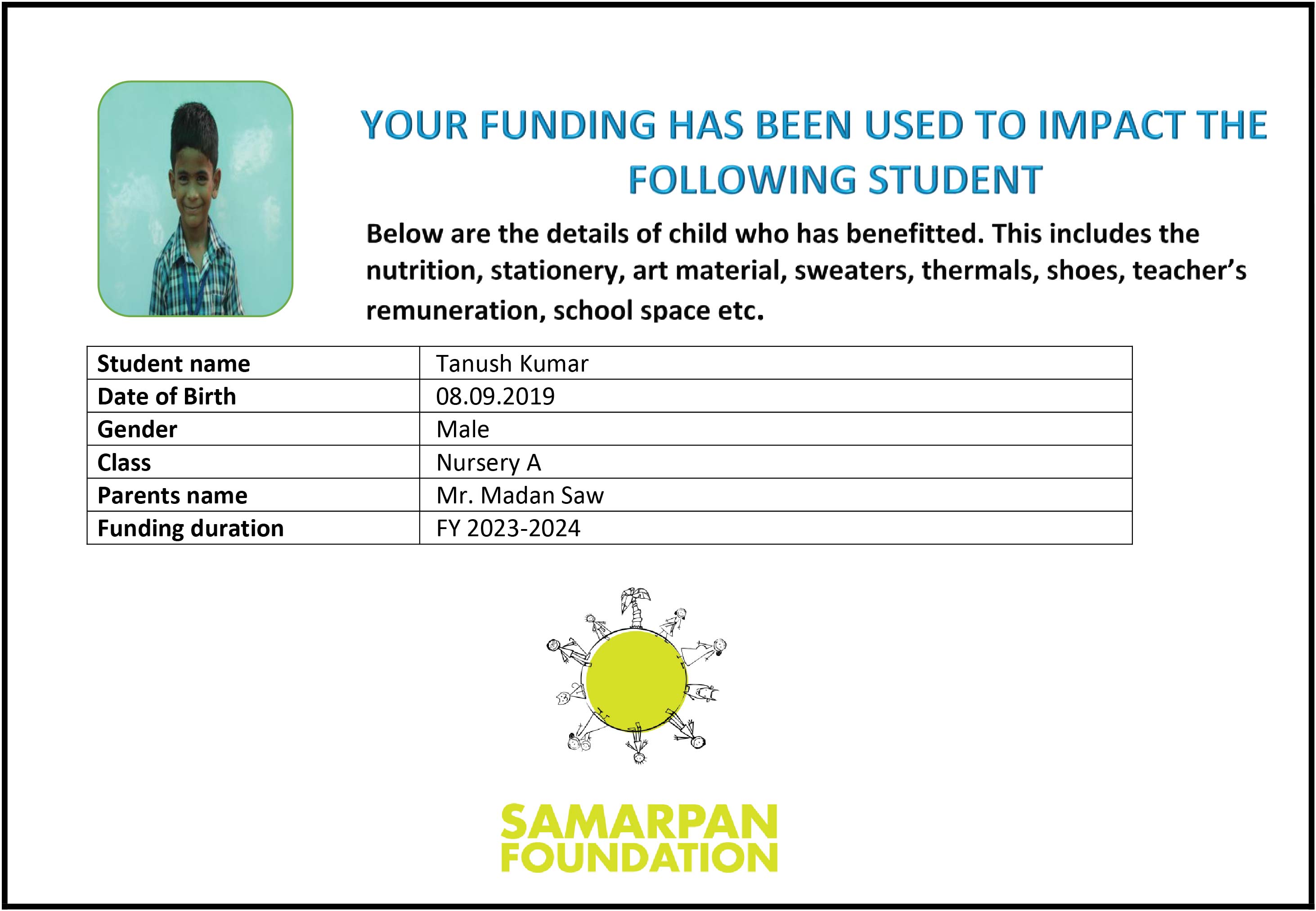 To ensure that there is complete transparency I shall get a report from SAMARPAN FOUNDATION This takes between 1 to 3 months usually after the funds are raised & transferred to them) telling me who benefitted from the funding. The details will then be posted on the UPDATES section of my campaign and will be in a format like the one below. As soon as I post an update the platform will send an EMAIL alert to all the funders. i.e. to you. Click on the link on the email and you can read about which child benefitted. That's transparent right.