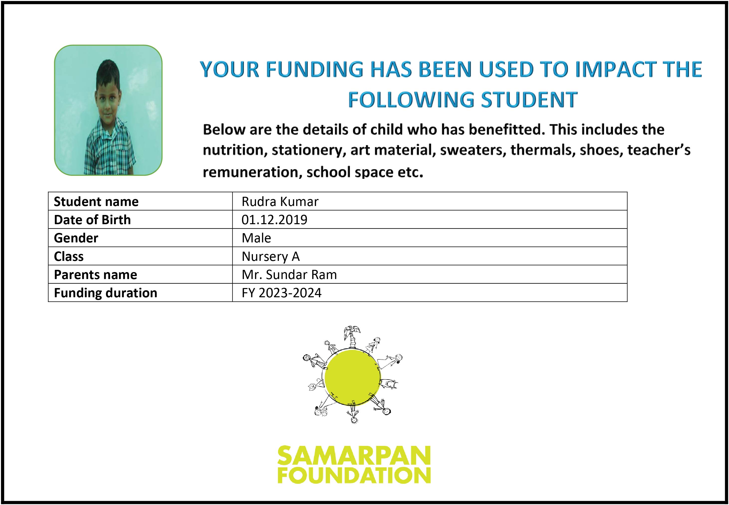 To ensure that there is complete transparency I shall get a report from SAMARPAN FOUNDATION This takes between 1 to 3 months usually after the funds are raised & transferred to them) telling me who benefitted from the funding. The details will then be posted on the UPDATES section of my campaign and will be in a format like the one below. As soon as I post an update the platform will send an EMAIL alert to all the funders. i.e. to you. Click on the link on the email and you can read about which child benefitted. That's transparent right.