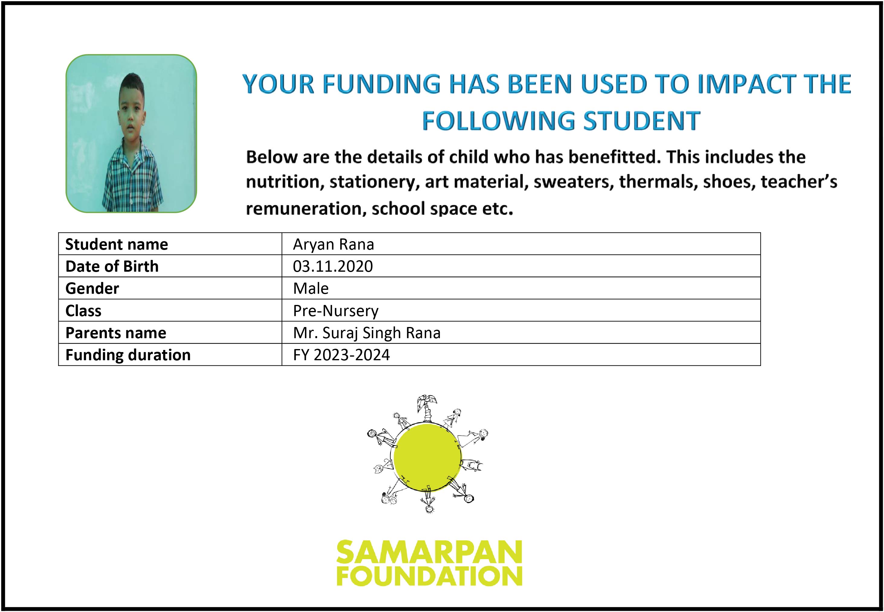 To ensure that there is complete transparency I shall get a report from SAMARPAN FOUNDATION This takes between 1 to 3 months usually after the funds are raised & transferred to them) telling me who benefitted from the funding. The details will then be posted on the UPDATES section of my campaign and will be in a format like the one below. As soon as I post an update the platform will send an EMAIL alert to all the funders. i.e. to you. Click on the link on the email and you can read about which child benefitted. That's transparent right.