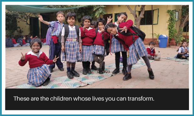 All it takes is INR 2500 to impact a child for a month this includes 2 meals a day, education, uniforms, stationery, woollens, etc.