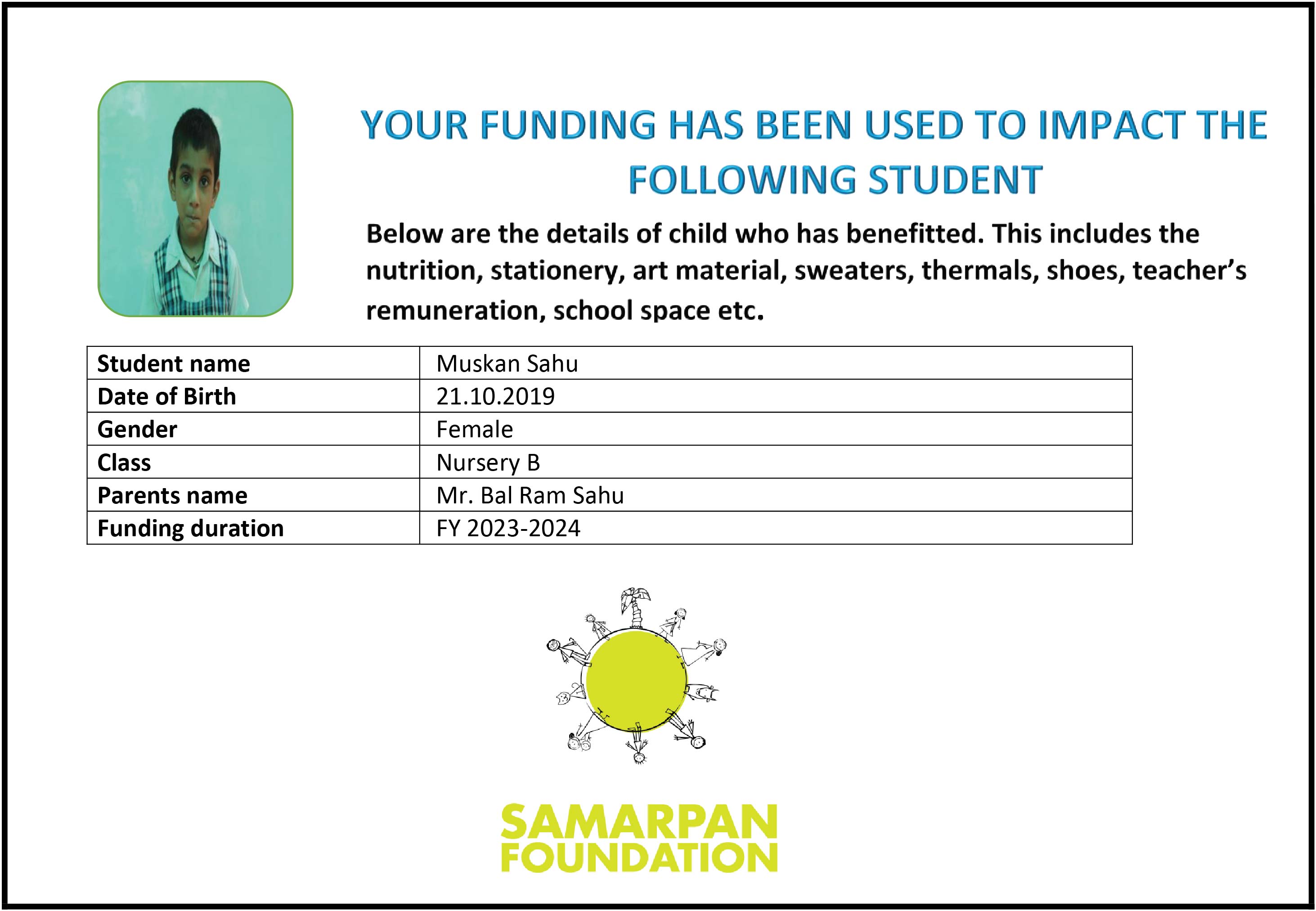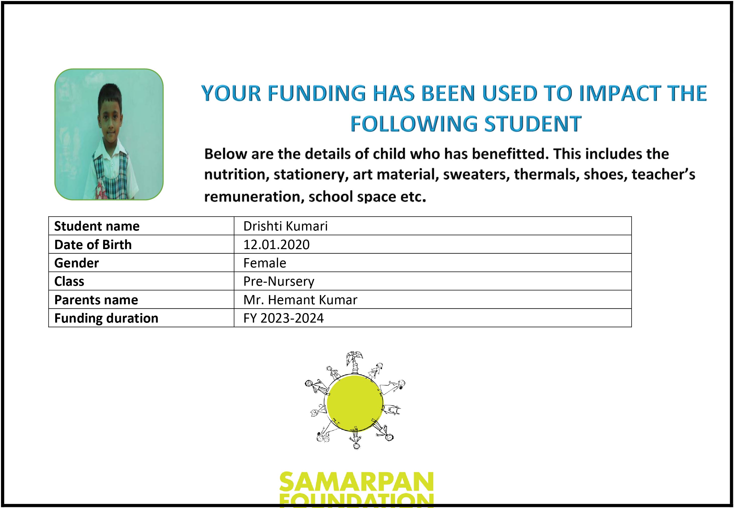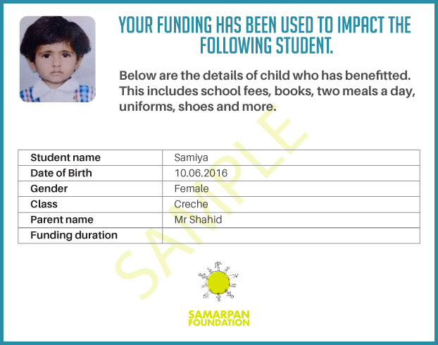 To ensure that there is complete transparency I shall get a report from SAMARPAN FOUNDATION This takes between 1 to 3 months usually after the funds are raised & transferred to them) telling me who benefitted from the funding. The details will then be posted on the UPDATES section of my campaign and will be in a format like the one below. As soon as I post an update the platform will send an EMAIL alert to all the funders. i.e. to you. Click on the link on the email and you can read about which child benefitted. That's transparent right.