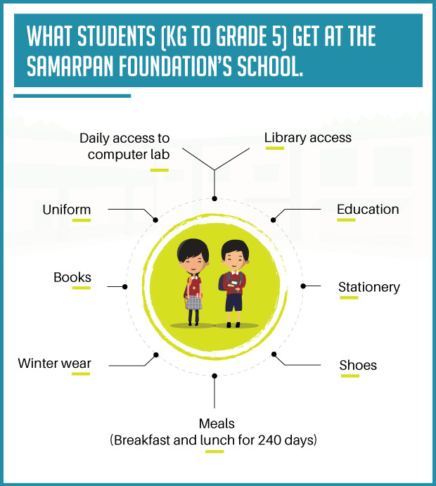 The Samarpan Foundation runs a primary school in Kishangarh village, Delhi. The students at the school are not only given an education they are also provided with healthy meals, uniforms books stationery, and a lot more. The Primary School also serves as a Bridge School for late starters covering nursery to kindergarten classes (children aged 3 to 5 years) and Primary Education: Classes 1 to 5 (children aged 6 to 10 years). The meals are a balanced diet that consists of pulses, cereals, and vegetables. Fruits are provided. There are 240 children in this program. School timings are from 8:30 am to 1:30 pm approx. Both breakfast and lunch are given from Monday to Saturday.
