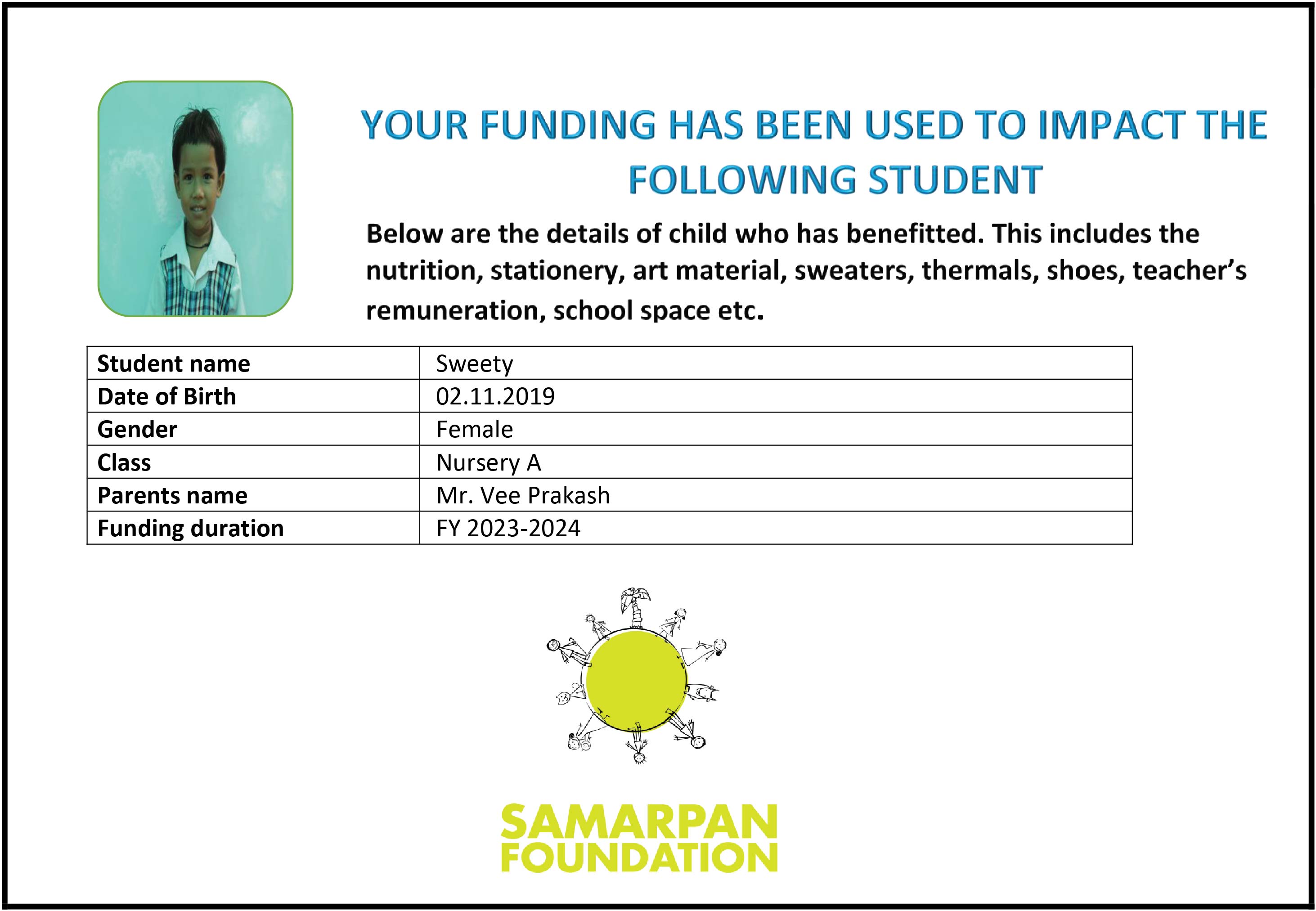 To ensure that there is complete transparency I shall get a report from SAMARPAN FOUNDATION This takes between 1 to 3 months usually after the funds are raised & transferred to them) telling me who benefitted from the funding. The details will then be posted on the UPDATES section of my campaign and will be in a format like the one below. As soon as I post an update the platform will send an EMAIL alert to all the funders. i.e. to you. Click on the link on the email and you can read about which child benefitted. That's transparent right.