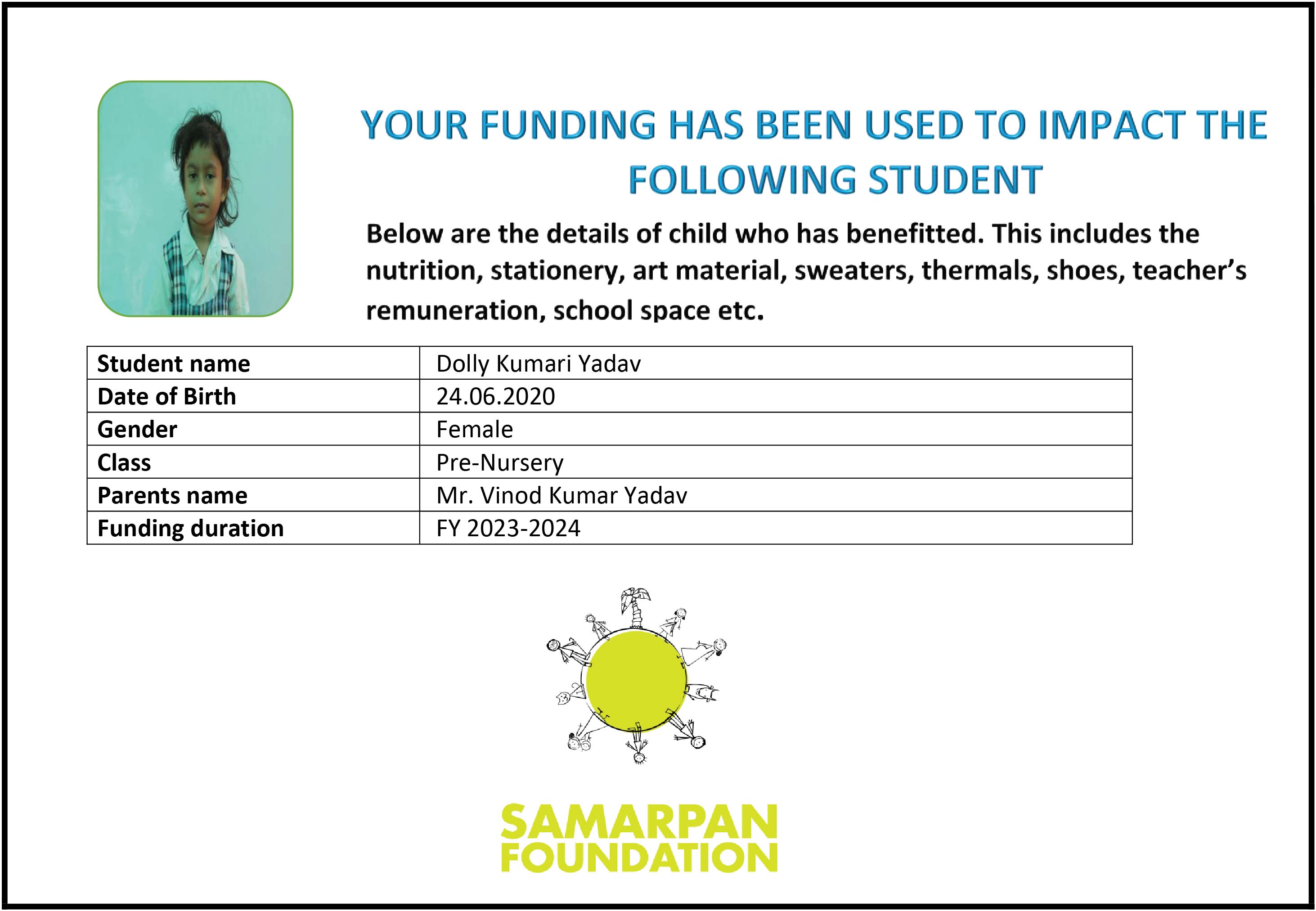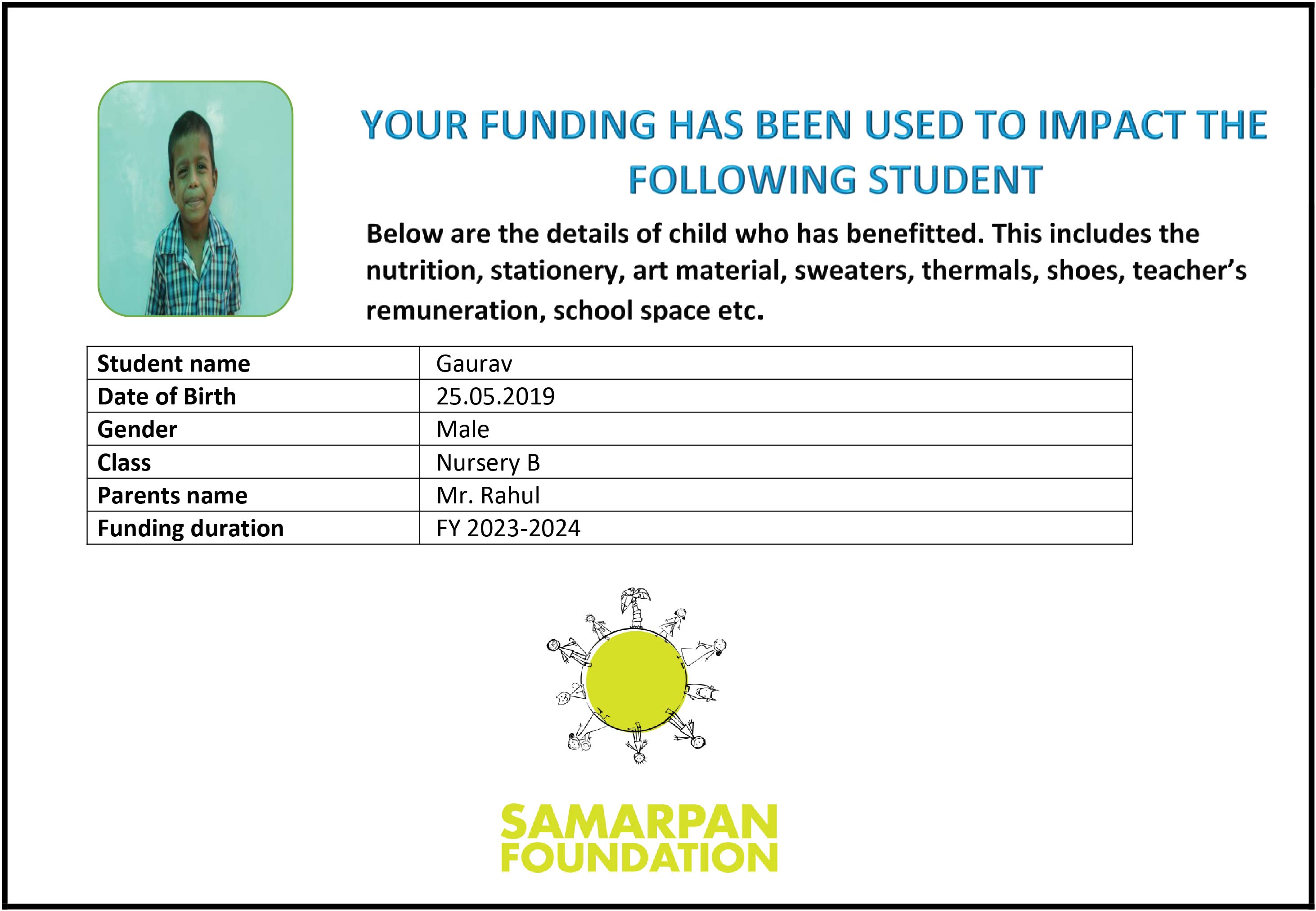 To ensure that there is complete transparency I shall get a report from SAMARPAN FOUNDATION This takes between 1 to 3 months usually after the funds are raised & transferred to them) telling me who benefitted from the funding. The details will then be posted on the UPDATES section of my campaign and will be in a format like the one below. As soon as I post an update the platform will send an EMAIL alert to all the funders. i.e. to you. Click on the link on the email and you can read about which child benefitted. That's transparent right.
