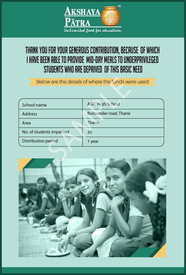 Funding for this campaign is eligible for tax breaks as Akshaya Patra Foundation as an NGO is a registered trust and you can avail of benefits under section 80G of the IT act.