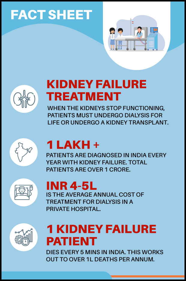 Kidney failure is a debilitating condition that affects millions of people in India. Normally, the kidneys filter the blood, remove harmful waste products and excess fluid and turn these into urine to be passed out of the body. When the kidneys fail to work it can be fatal.