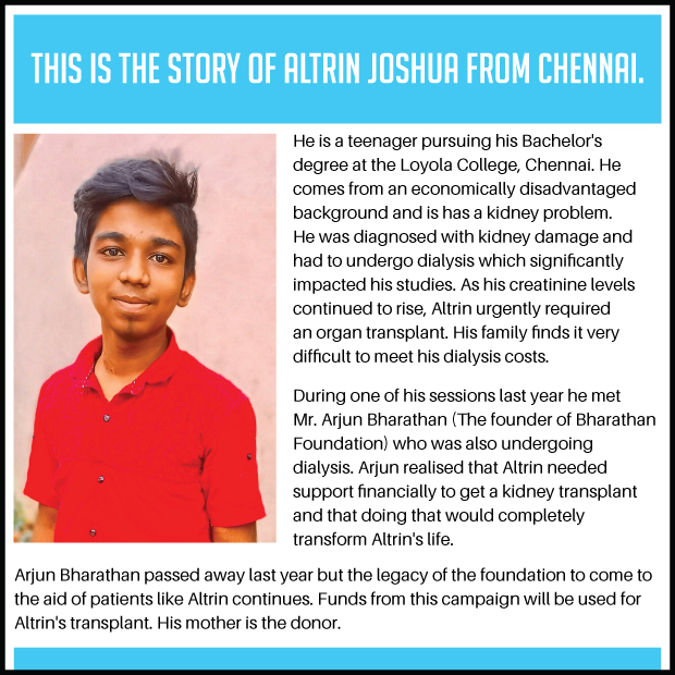 The Bharathan Medical Foundation is an NGO in Chennai, that helps people who require organ transplants and also helps them with dialysis. They are partnering with