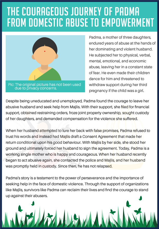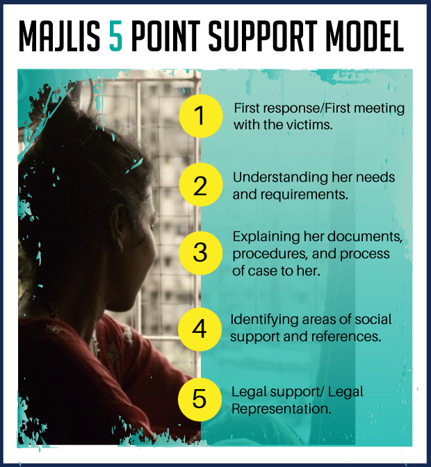 The Majlis Manch focuses on transforming victims into survivors. Majlis is a team of like-minded women lawyers and social workers who work for the protection and promotion of women's and children’s rights through legal representation, advocacy, and training. They provide social and legal support to women and children victims of sexual and domestic violence.