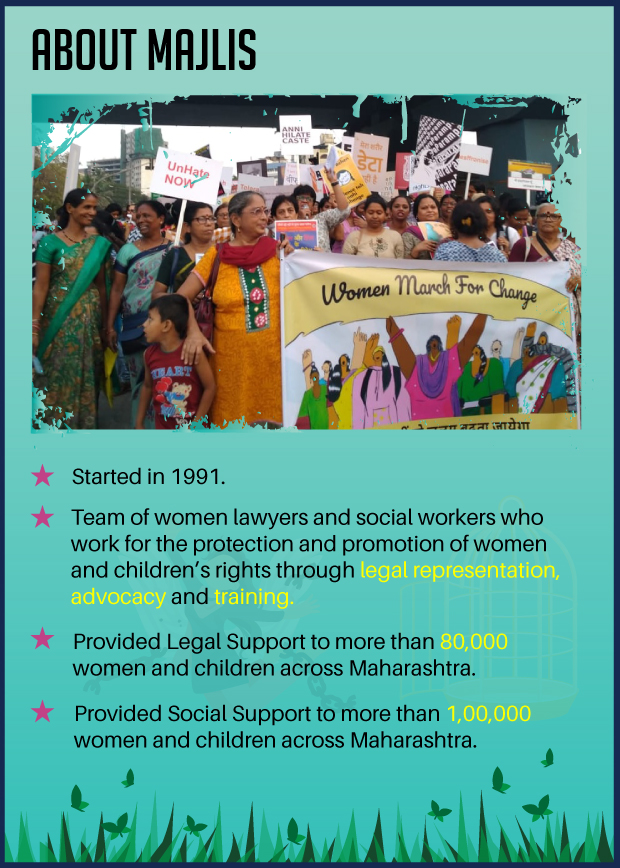 ‘Majlis’ means association in several Asian countries. The name reflects our broad-based pluralistic and multicultural ideology. The founder members of Majlis were part of the women’s movement in Mumbai. The organization was registered as a Society and Public Trust in 1991. The Legal Centre of Majlis was founded by Adv. Flavia Agnes, a legal scholar on women’s rights, is a center for rights discourse and legal initiatives to address issues of women and children facing violence. Their vision is to provide access to justice to all women and children facing violence by providing legal support, advocacy, and training.