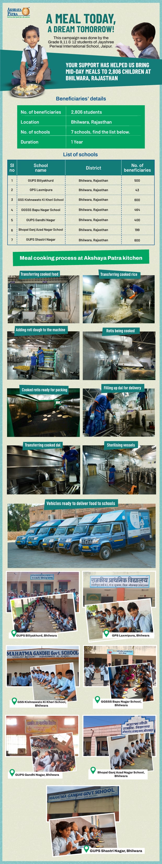 The Mid-day meal will be distributed to 263527 children in 3195 schools across Rajasthan. We can provide mid-day meals for more students if we raise more funds. This will help bring more smiles and cheers to students and help us achieve the Foundation’s Vision that ‘’No child in India shall be deprived of Education, because of Hunger’’.