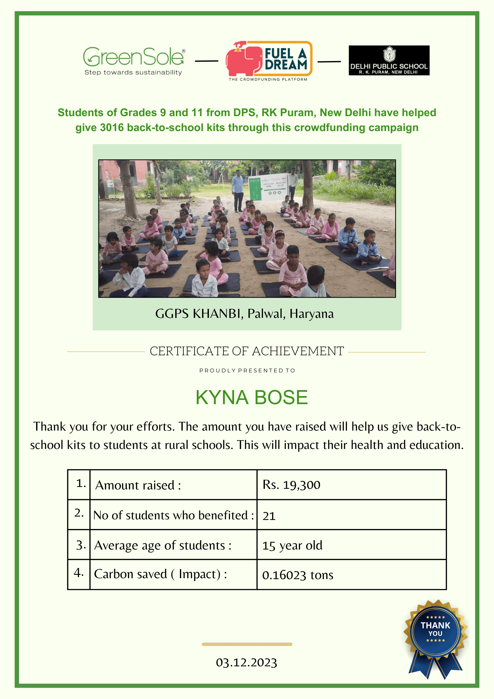 My name is KYNA BOSE. I am 13-years-old and a Grade 9 student at DPS, R.K Puram, New Delhi