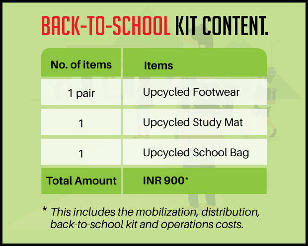 The back-to-school kit costs just INR 900 and gives students a pair of recycled footwear, a recycled study mat to sit comfortably at school or home and a recycled school bag for books. This is a very small amount to impact a student. Fund INR 3600 for example and transform the lives of 4 students.