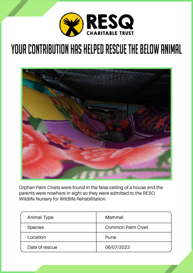 Maharashtra is home to a diverse population of wild animals, many of whom are key species identified to be globally declining. The Pune-based NGO - RESQ provides emergency aid to animals in distress. Thousands of wild animals come to RESQ annually who are either injured, sick, orphaned, or victims of wildlife trafficking and illegal captivity.