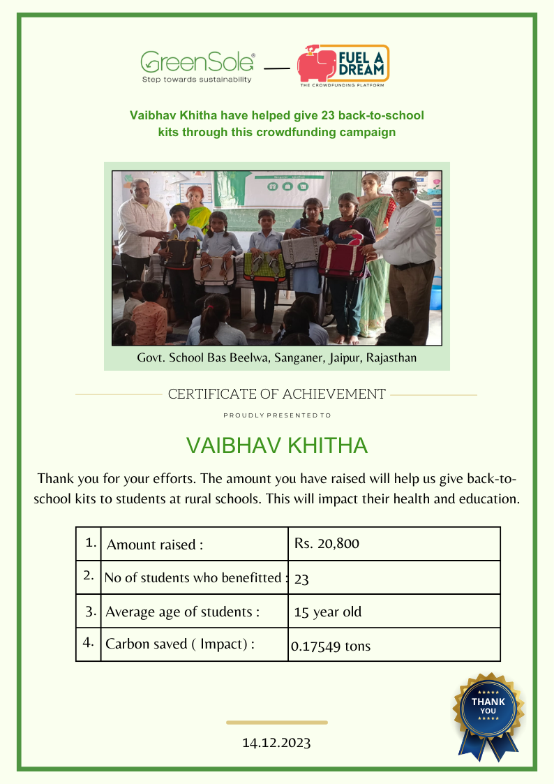 I have undertaken this campaign because I was surprised to learn that many students from low-income homes in Rajasthan who go to school (mainly govt schools) do not have basic school gear like proper footwear or a school bag and often sit on the hard ground in order to study at school.