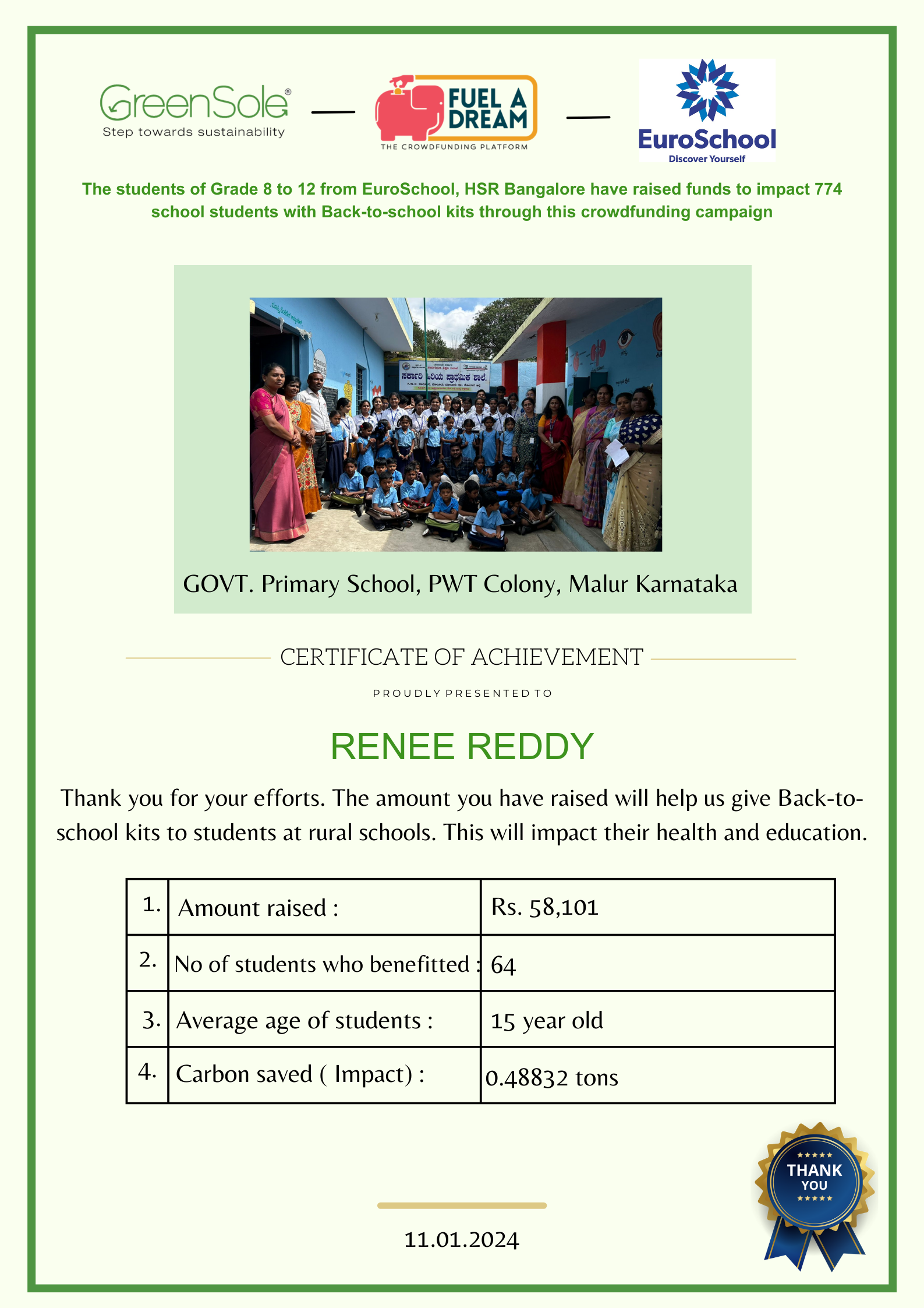 My name is Renee Reddy. I am 13-years-old and a Grade 8 student at EuroSchool, HSR, Bengaluru.