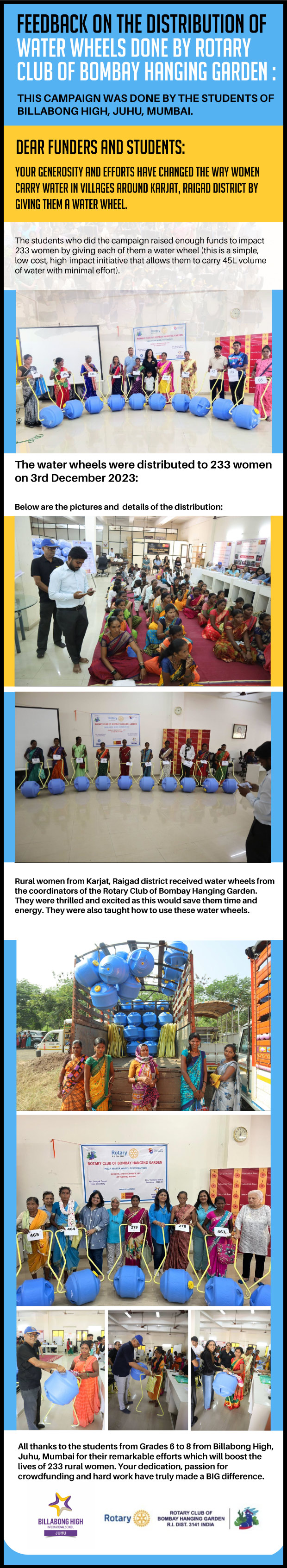 Please support my campaign and let us together bring joy to more women in these tribal areas. The Water wheels will be distributed by the team from the Rotary Club of Hanging Gardens with their local partners. The cost of doing this (including identifying the women, the cost of the water wheel, and the actual distribution ) is only INR 3000 per water wheel making it truly a revolutionary idea. Let's together impact and change the lives of these women in rural areas of Maharashtra.
