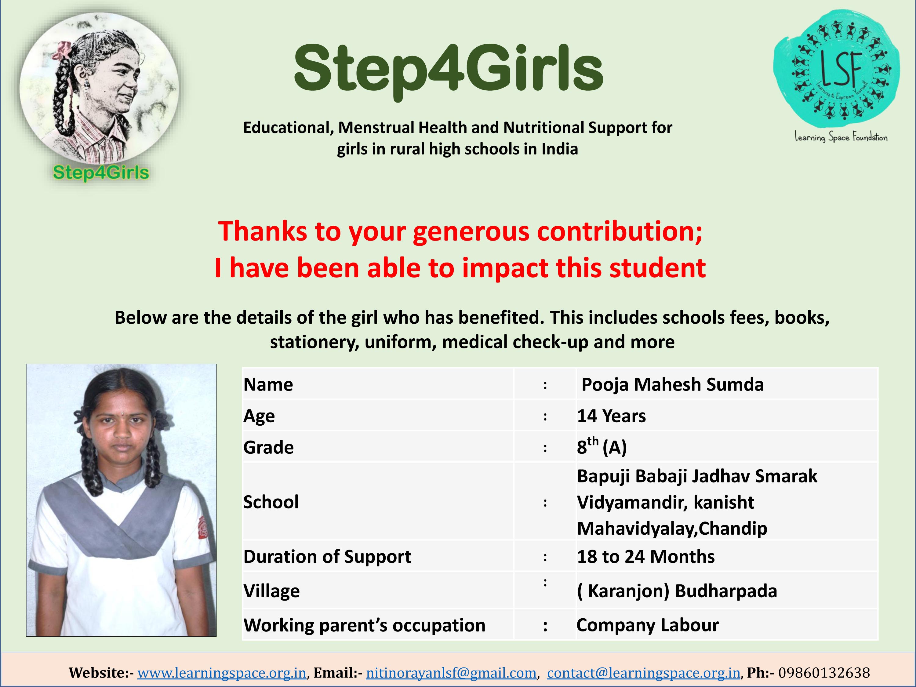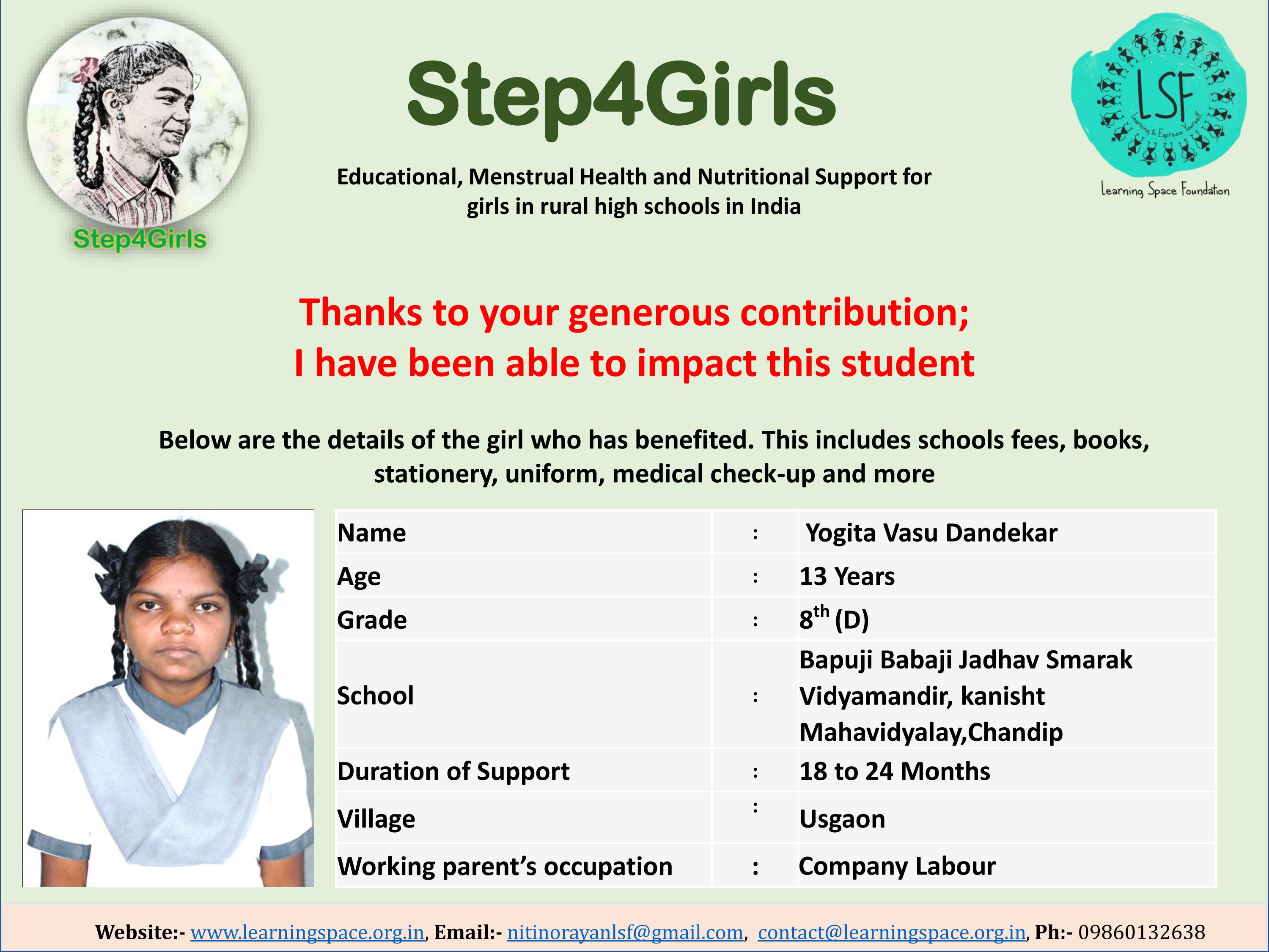 I was thrilled to learn about this initiative that provides education to underprivileged girls in Palghar and Thane districts. This will help them continue their education and achieve their dreams. Just INR 12000 will support their education for an entire year.