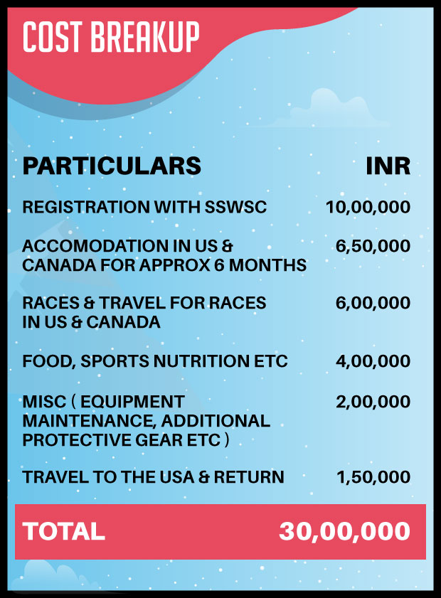 I require INR 30 Lakh (detailed cost break-up given below) for my training, travel, stay, food, fitness, equipment, etc. This will help me dramatically improve my skill levels and get me into a position where I can aspire to win a medal in the upcoming Winter Olympics 2026!