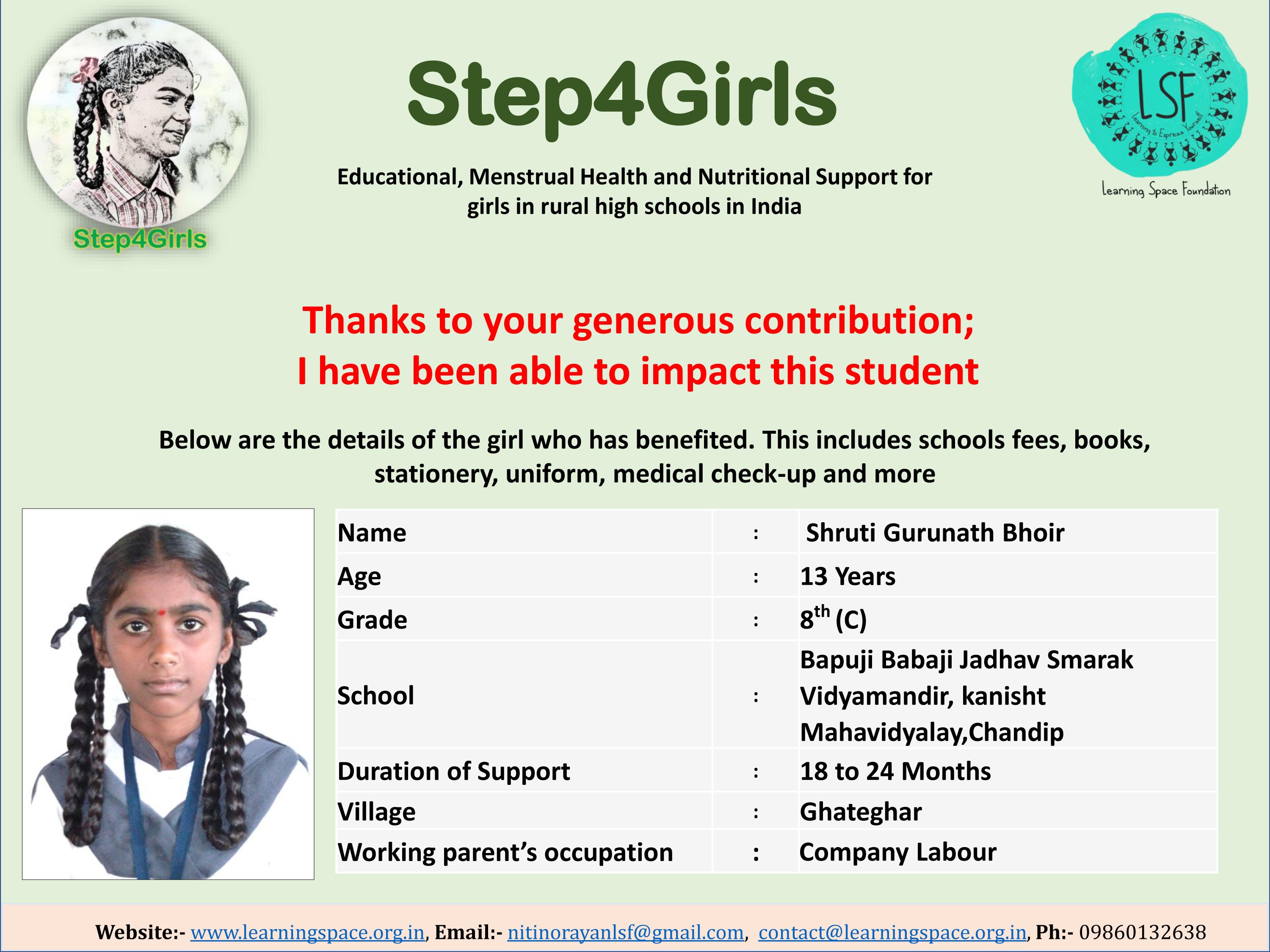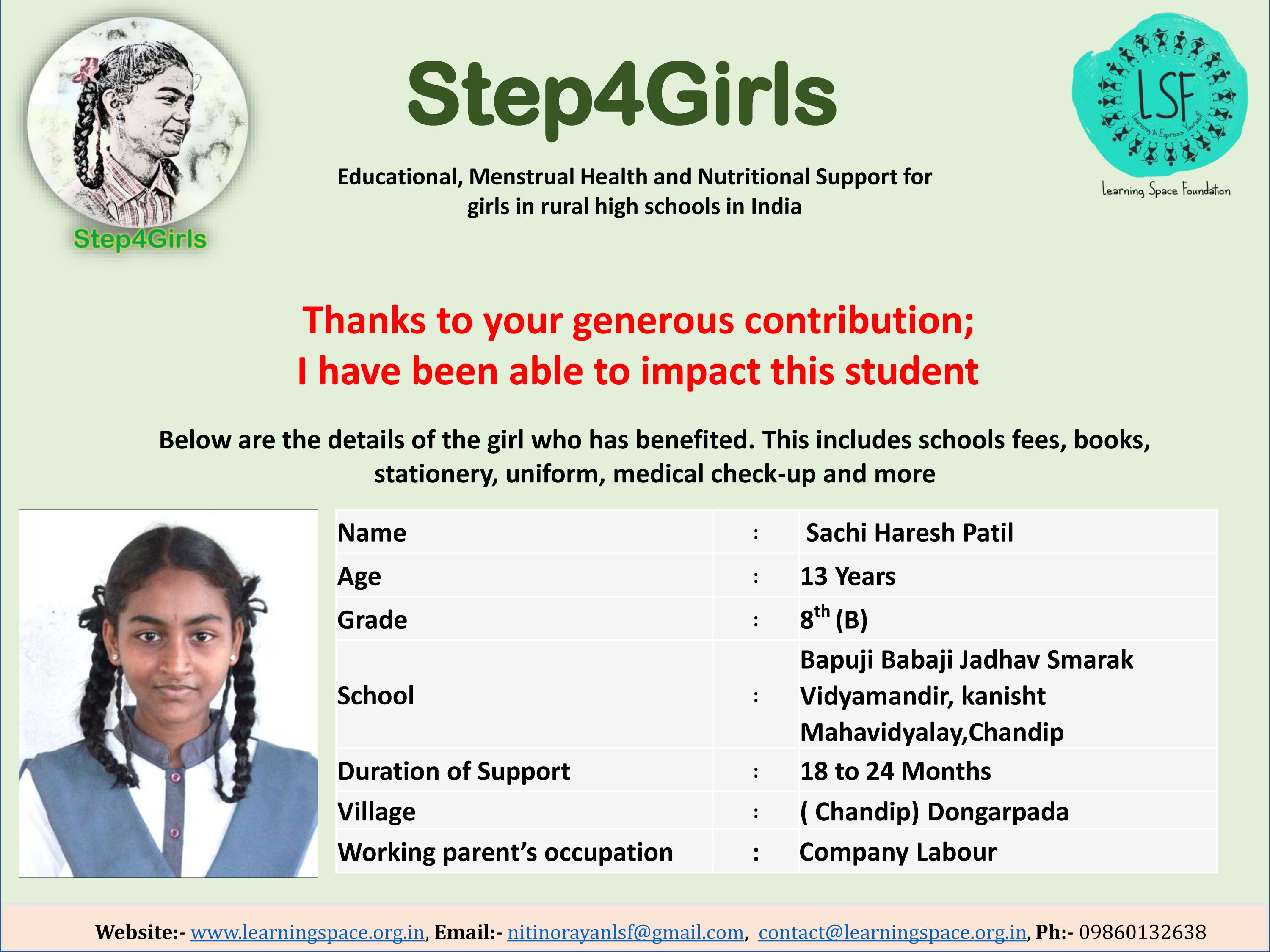 I was thrilled to learn about this initiative that provides education to underprivileged girls in Palghar and Thane districts. This will help them continue their education and achieve their dreams. Just INR 12000 will support their education for an entire year.