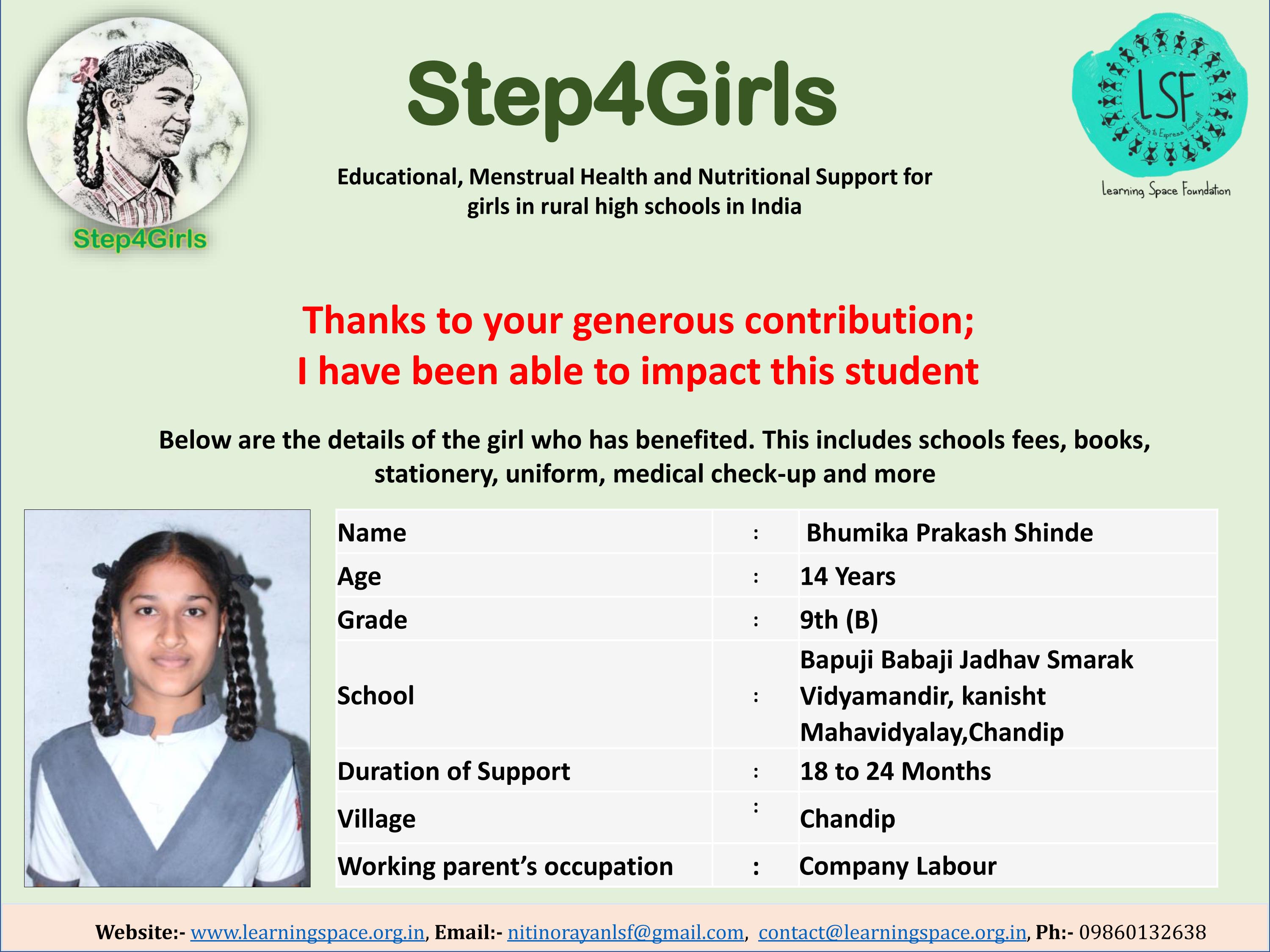 I was thrilled to learn about this initiative that provides education to underprivileged girls in Palghar and Thane districts. This will help them continue their education and achieve their dreams. Just INR 12000 will support their education for an entire year.
