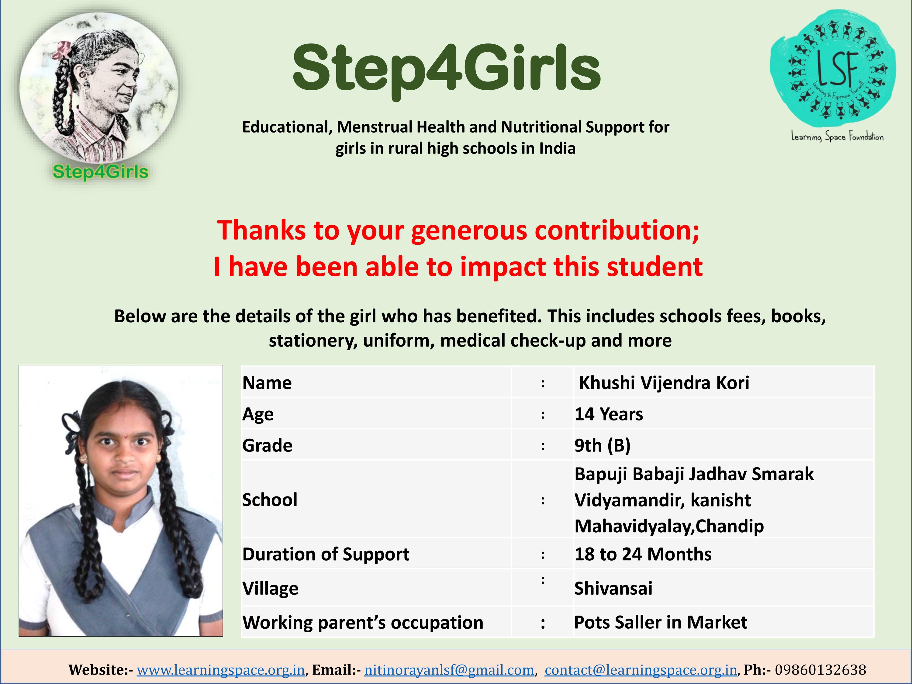 Please support my campaign as a simple act of kindness can have a profound impact on a girl's life. Let us together lend a helping hand and transform their lives.