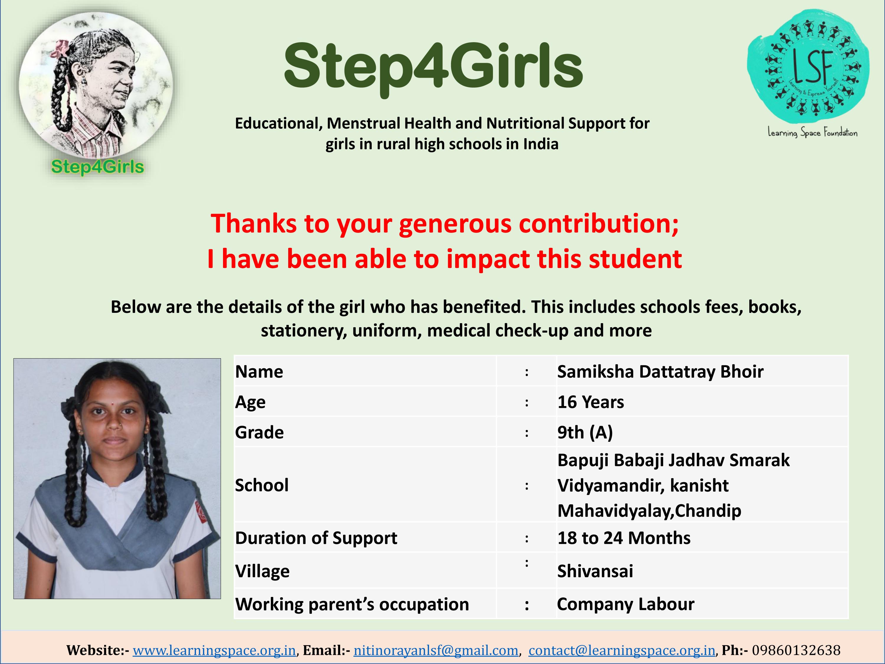 I was thrilled to learn about this initiative that provides education to underprivileged girls in Palghar and Thane districts. This will help them continue their education and achieve their dreams. Just INR 12000 will support their education for an entire year.