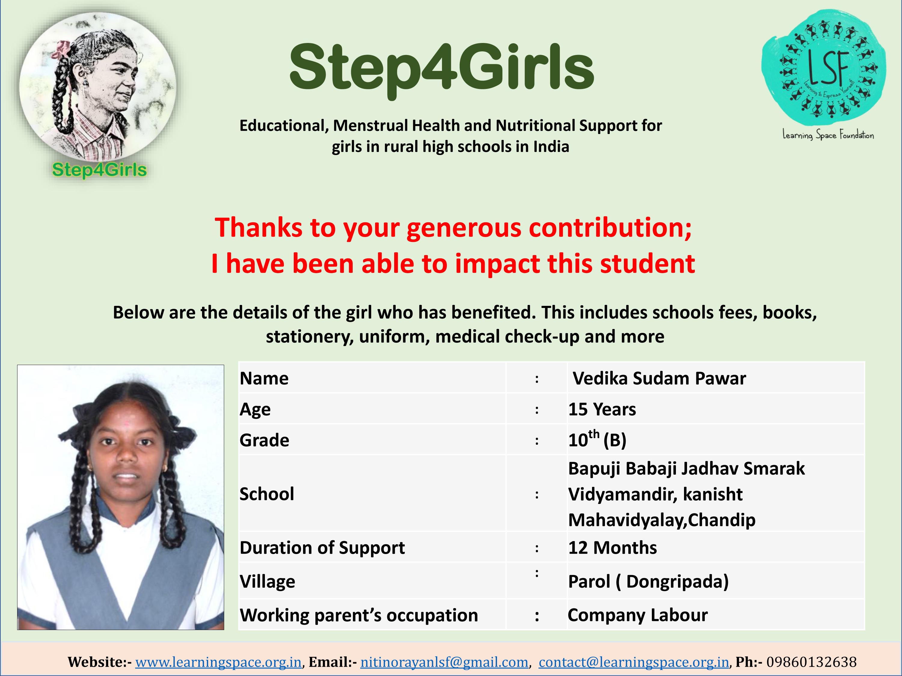 To ensure that there is complete transparency, the team at Learning Space Foundation will post feedback about 2-3 months after the campaign is over telling us which student benefitted from the funding. The details will then be posted on the UPDATES section of my campaign and will be in a format like the one below. Once the update is posted the platform will send an EMAIL alert to you. Click on the link and you can read about which child has benefitted. That's transparent, right?