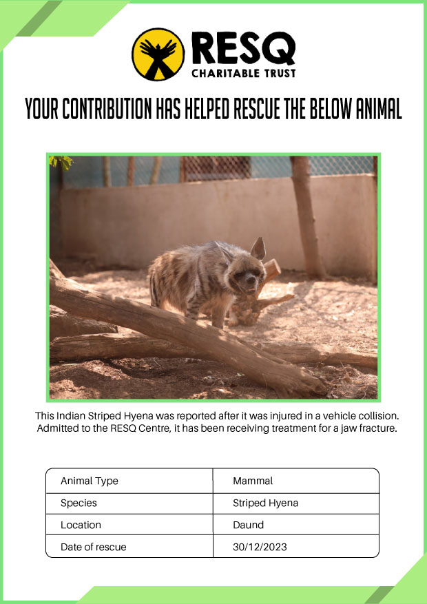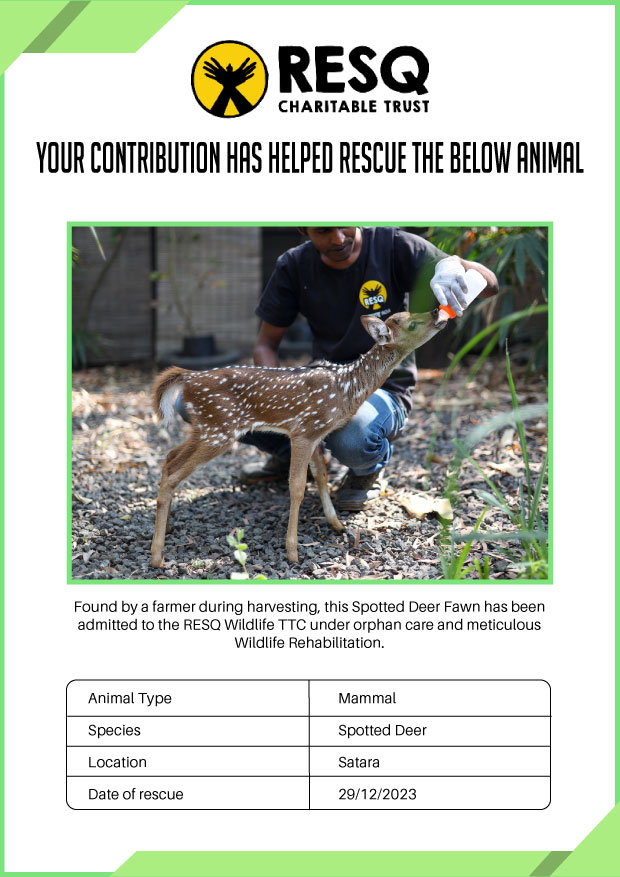 Maharashtra is home to a diverse population of wild animals, many of whom are key species identified to be globally declining. The Pune-based NGO - RESQ provides emergency aid to animals in distress. Thousands of wild animals come to RESQ annually who are either injured, sick, orphaned, or victims of wildlife trafficking and illegal captivity.