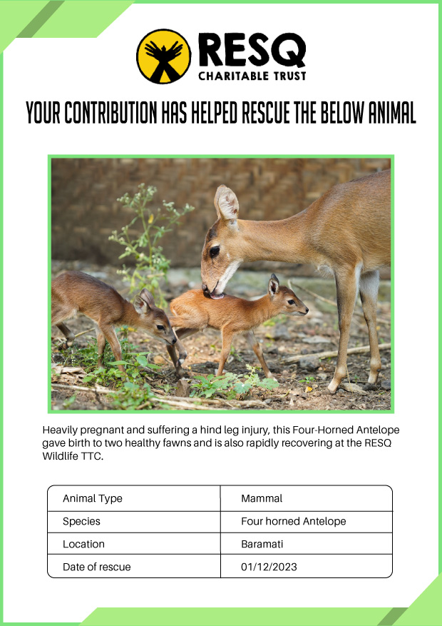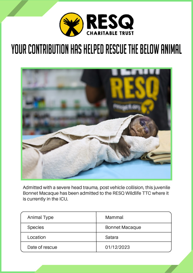 Maharashtra is home to a diverse population of wild animals, many of whom are key species identified to be globally declining. The Pune-based NGO - RESQ provides emergency aid to animals in distress. Thousands of wild animals come to RESQ annually who are either injured, sick, orphaned, or victims of wildlife trafficking and illegal captivity.