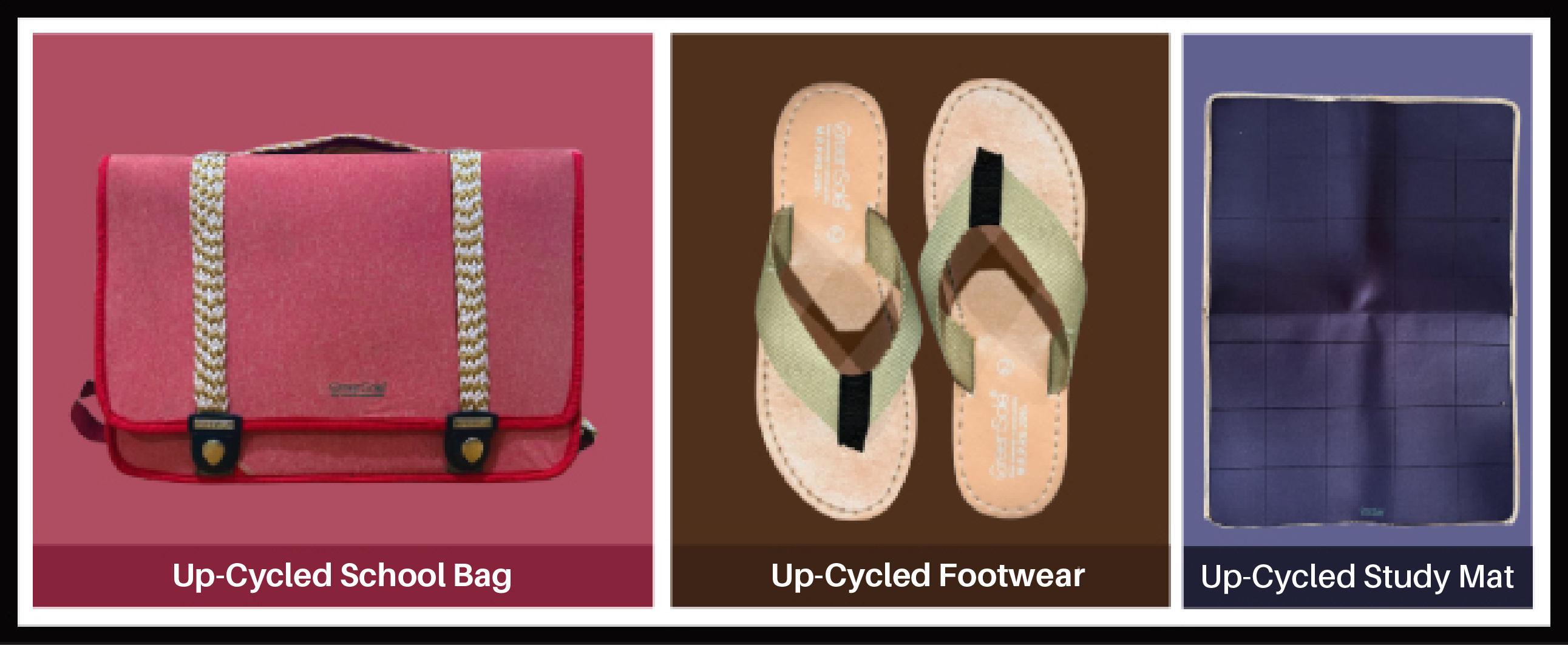 These elements are made from recycled material. For example, the sole from old footwear (which would be burnt or thrown into a landfill) is turned into new footwear. Old clothes are used to make the bags and mats. This is very environmentally friendly. Greensole also provides employment to women at their manufacturing unit.