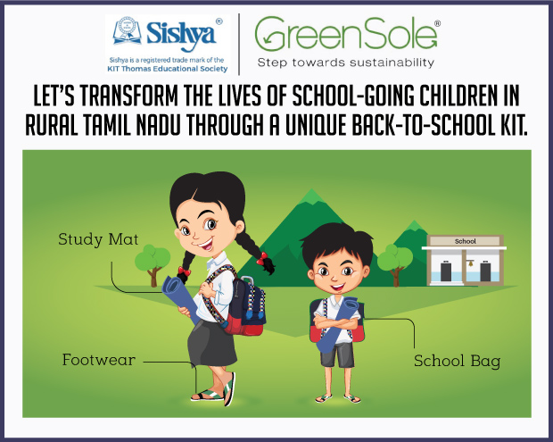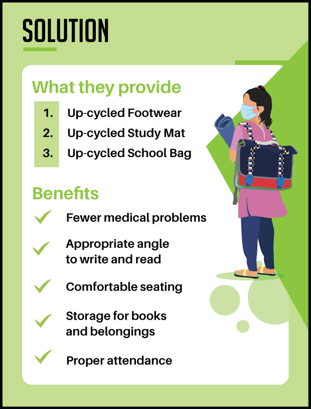 The back-to-school kit costs just INR 900 and gives students a pair of recycled footwear, a recycled study mat to sit comfortably at school or home and a recycled school bag for books. This is a very small amount to impact a student. Each kit costs just INR 900 including the cost of distribution. Fund INR 3600 for example and transform the lives of 4 students.