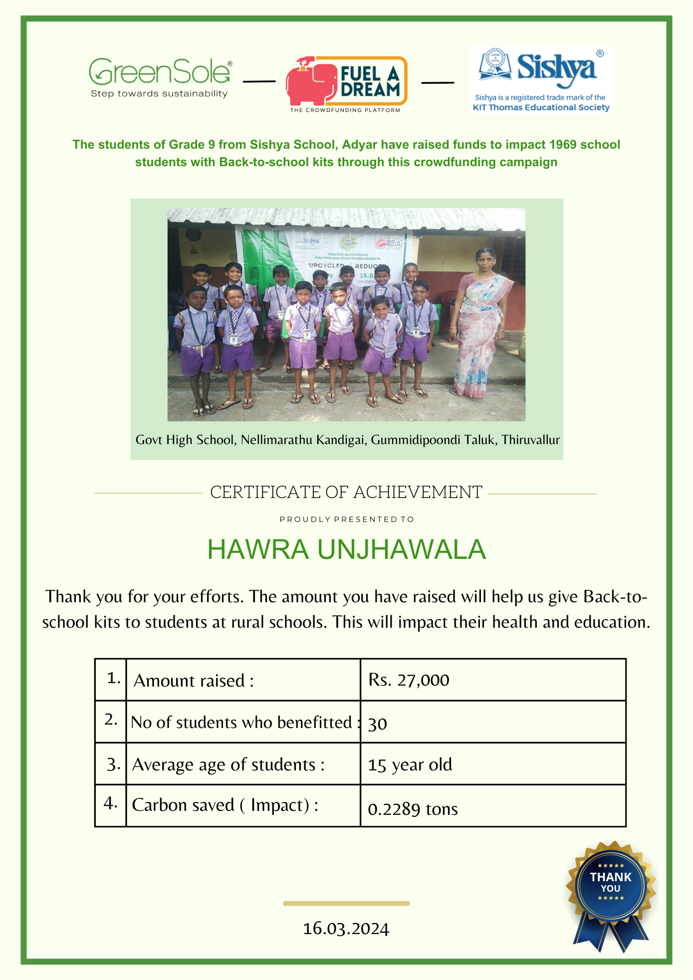 If more funds are raised, the back-to-school kits will be distributed to more schools in Tamil Nadu.