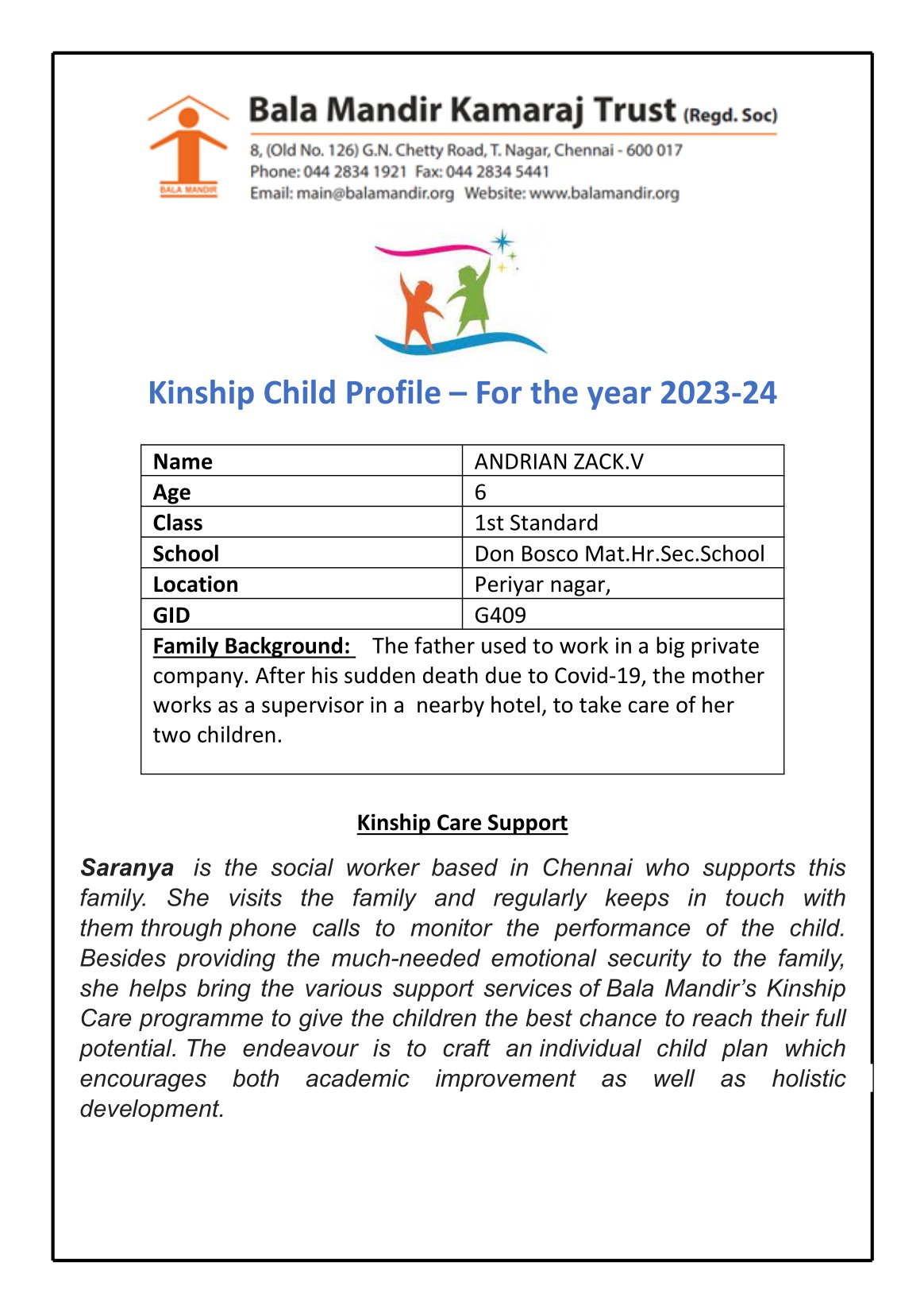 In July 2021 with the pandemic looming large and the world gripped by fear, shock, and uncertainty; Bala Mandir took the plunge to help orphaned children in need. To get started the list of Covid orphans was received from the office of the District Child Protection Officer in Chennai and the nearby districts. Using this list a few existing social workers of Bala Mandir were asked to visit the families to find out their status and need for support including possible admission in Bala Mandir homes.