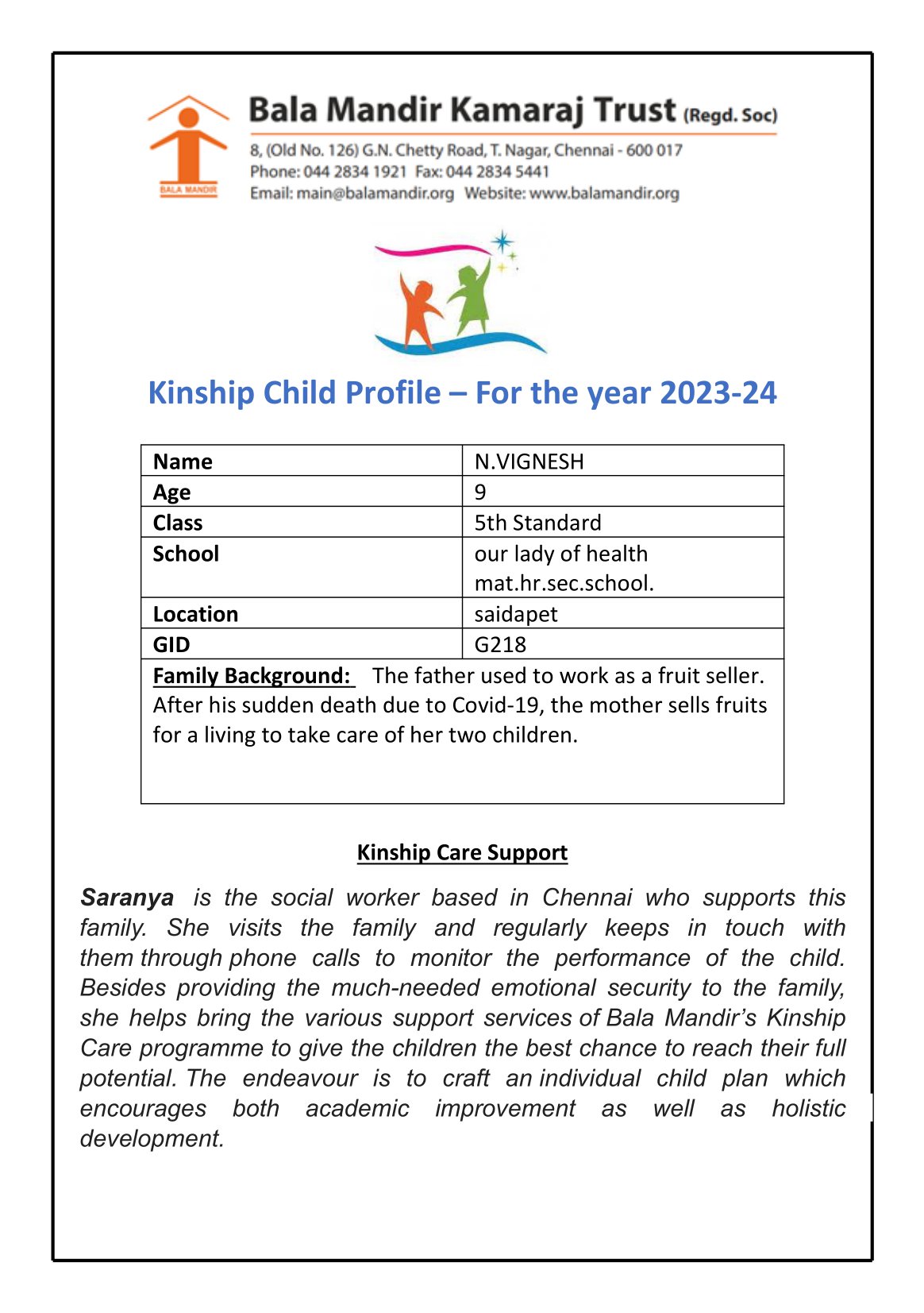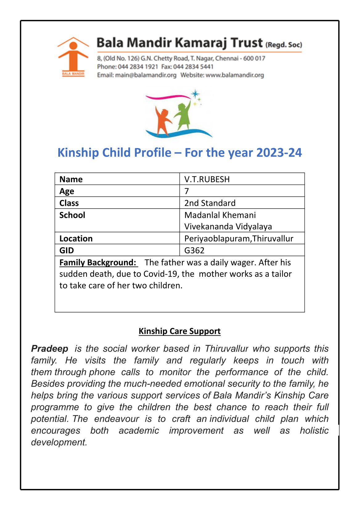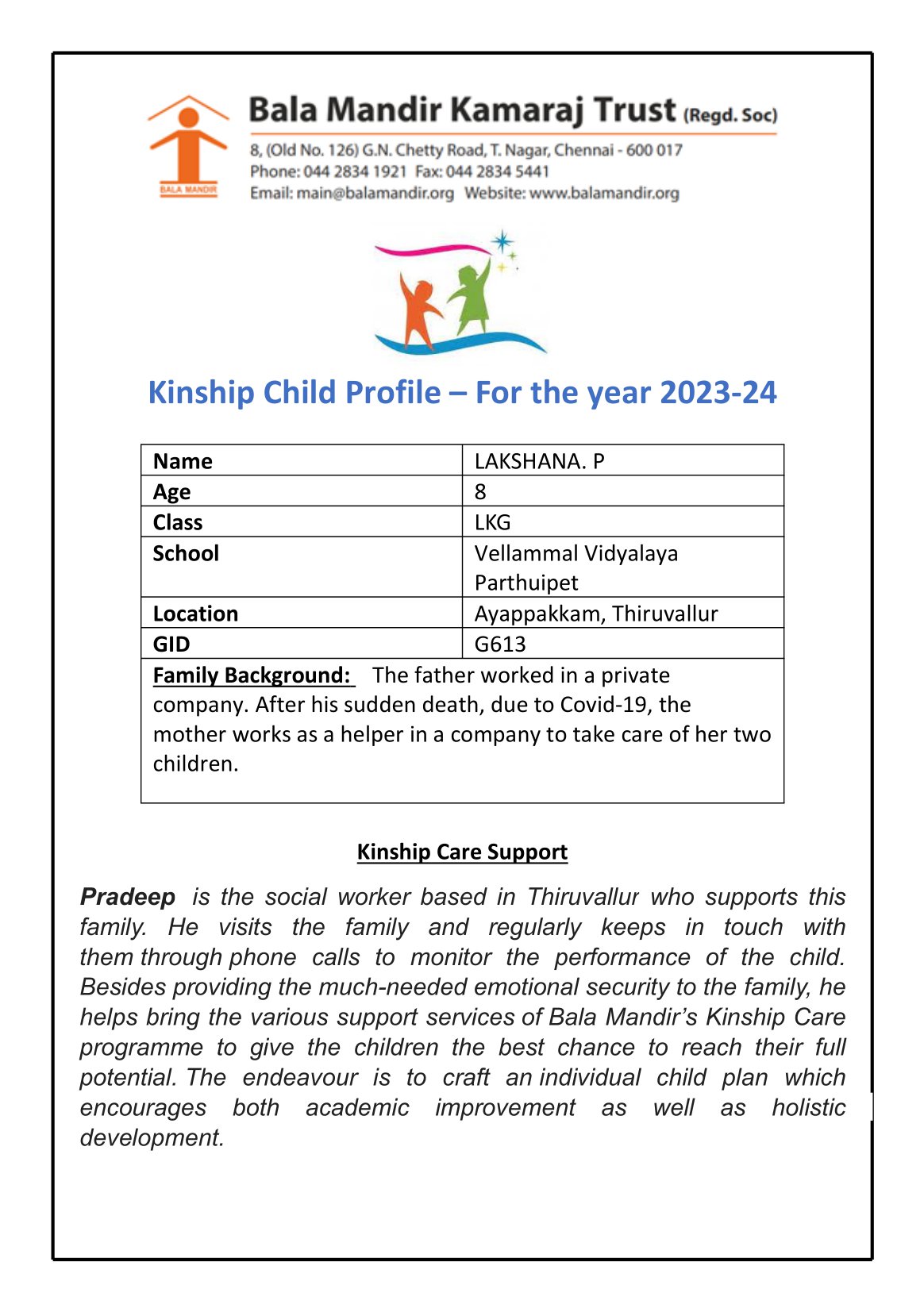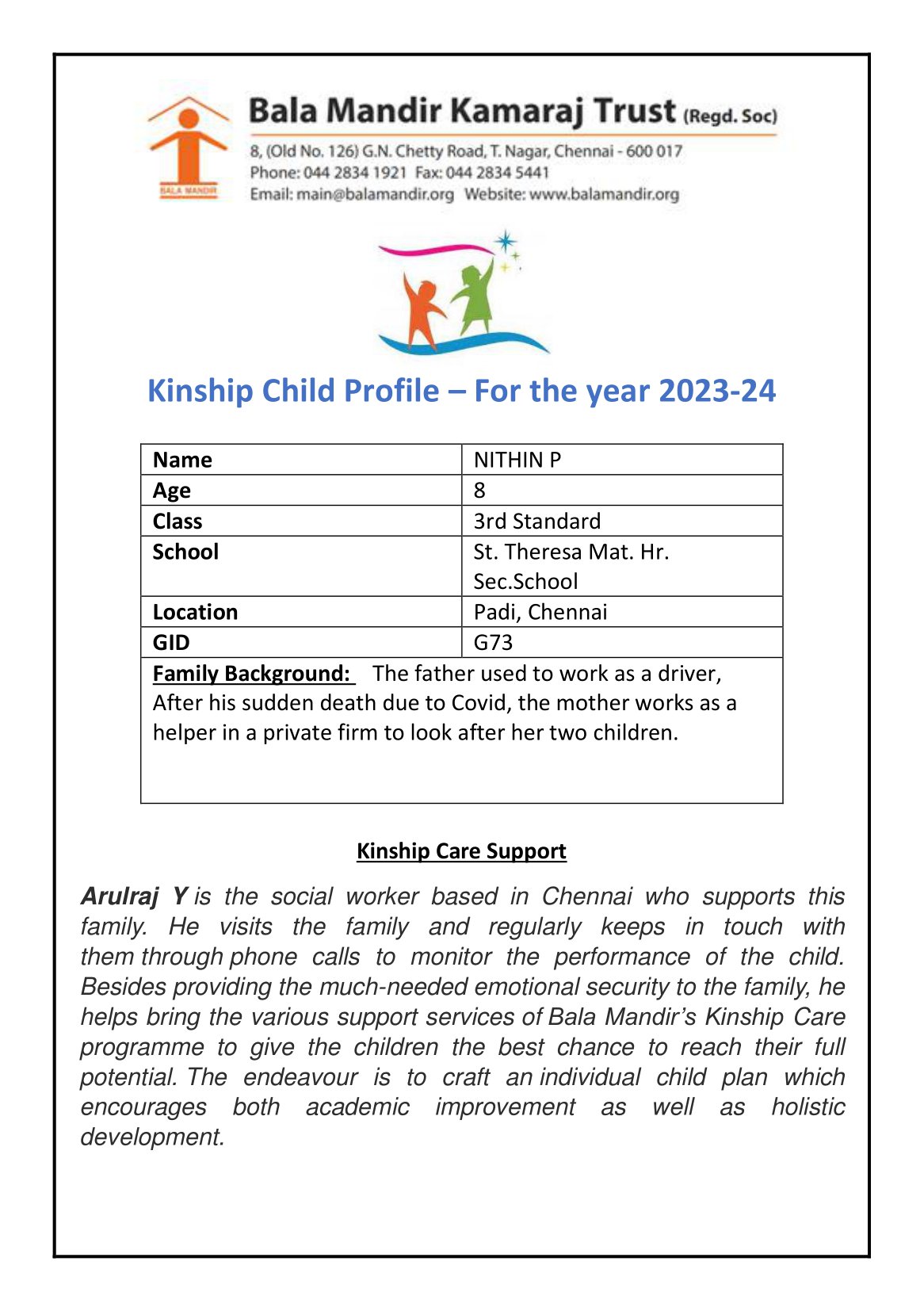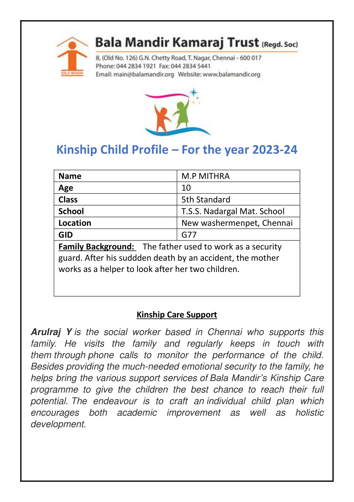 My name is P Natarajan. I am the Trustee and Treasurer of Bala Mandir Kamaraj Trust and we started the Kinship Care program after studying the setbacks faced by the children who suddenly lost one or both of their parents.