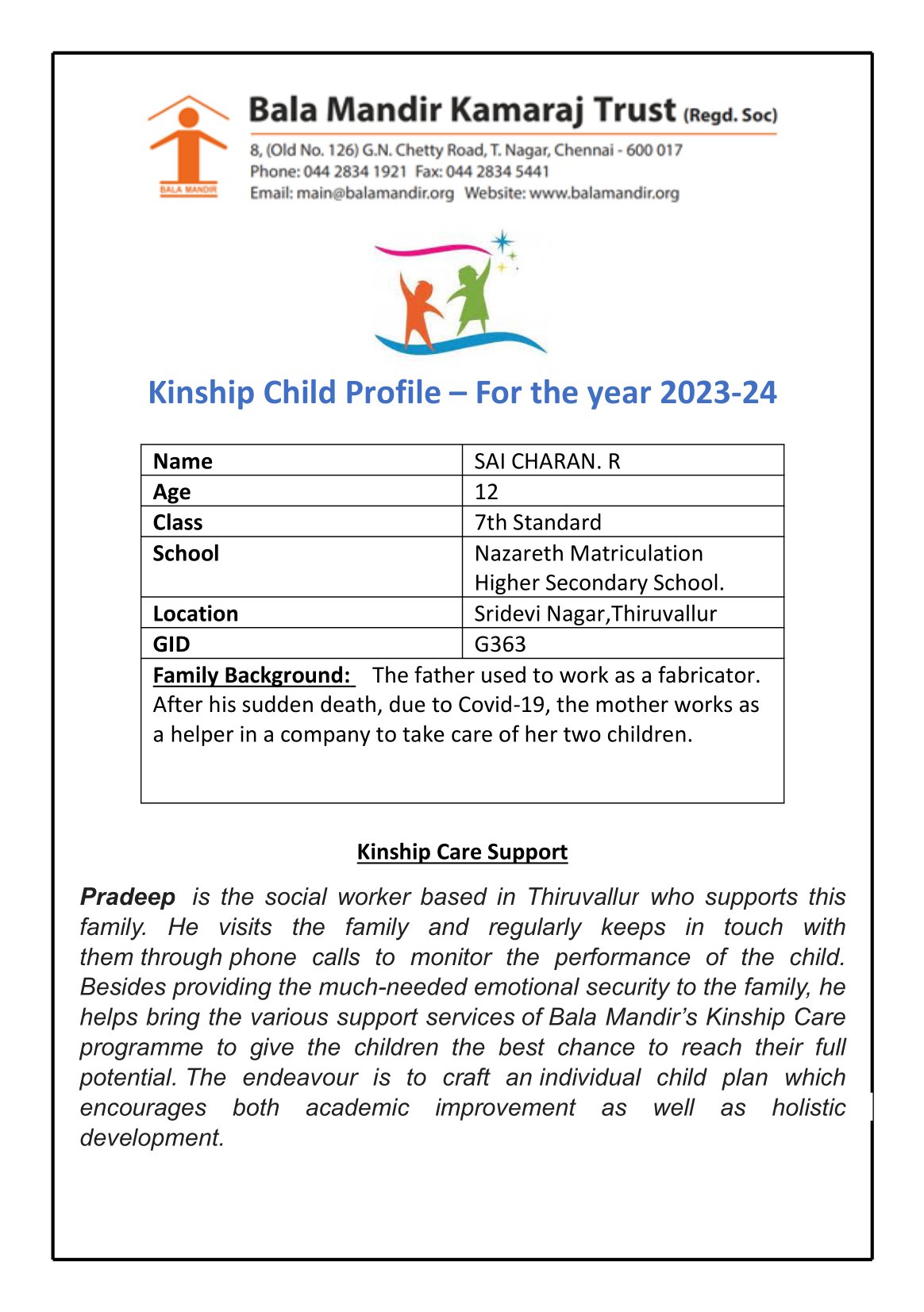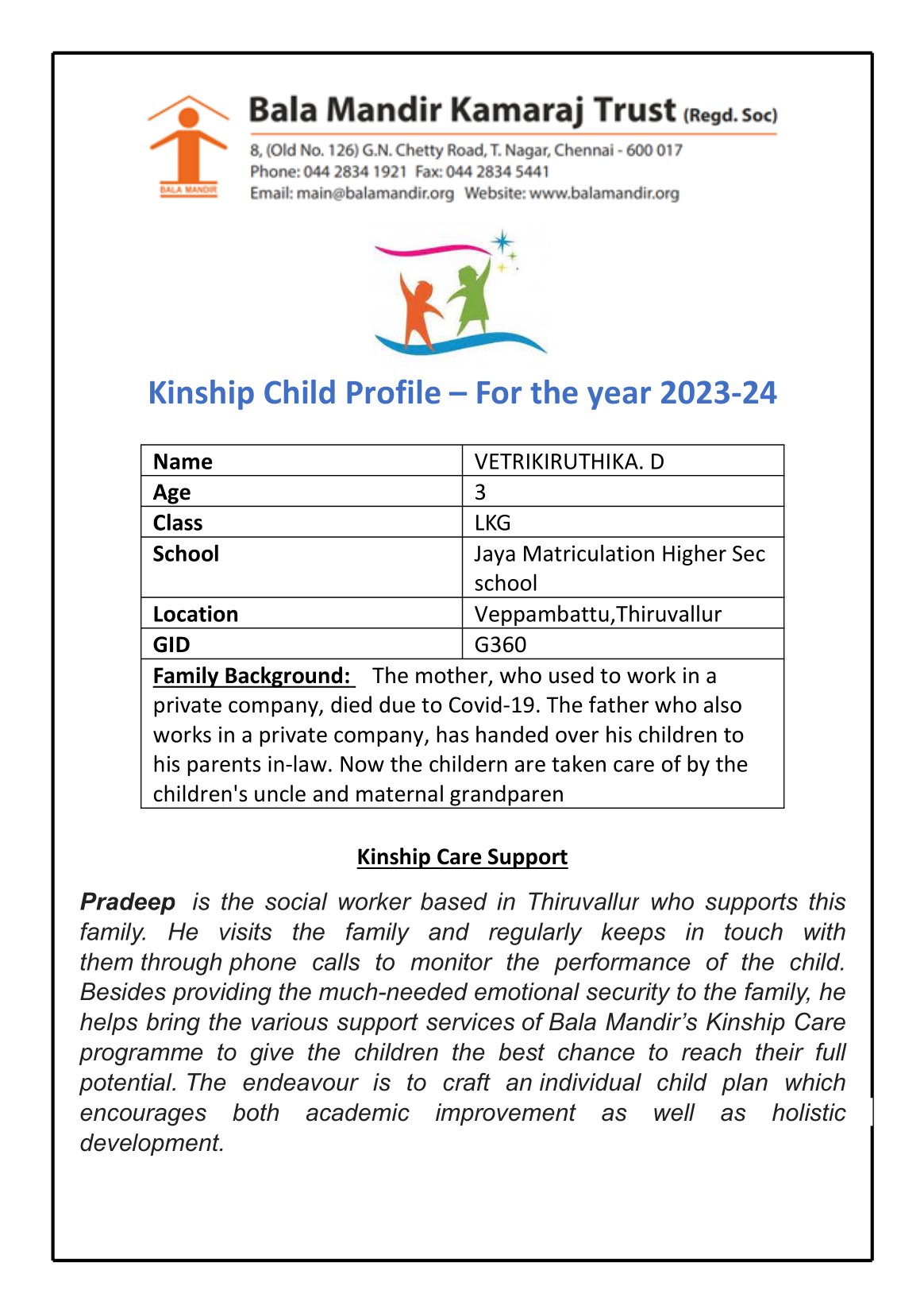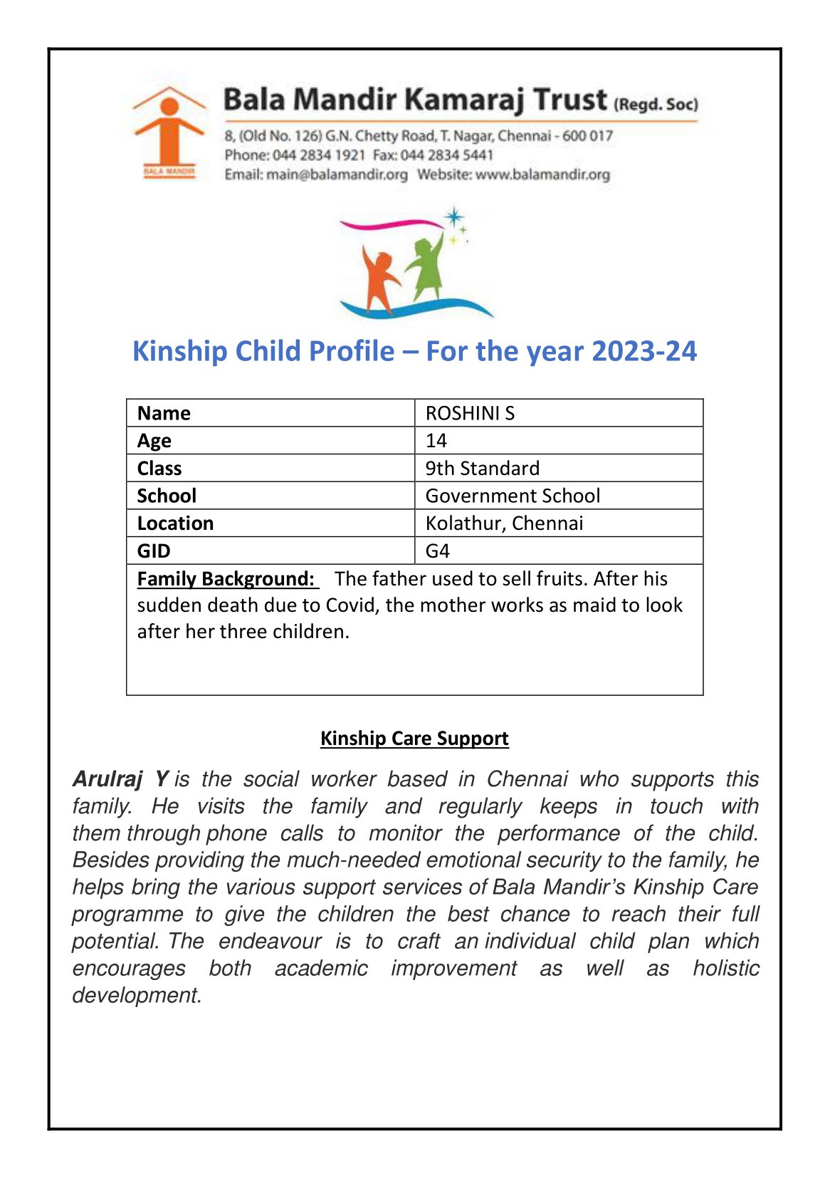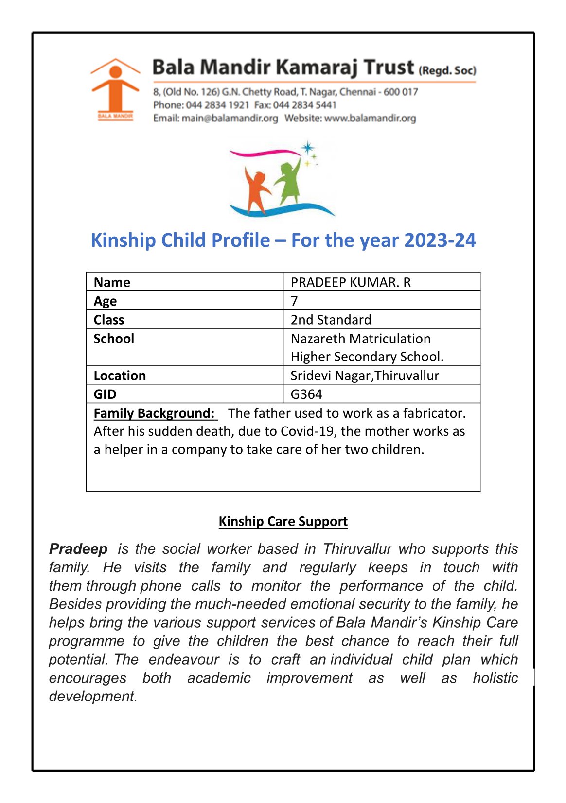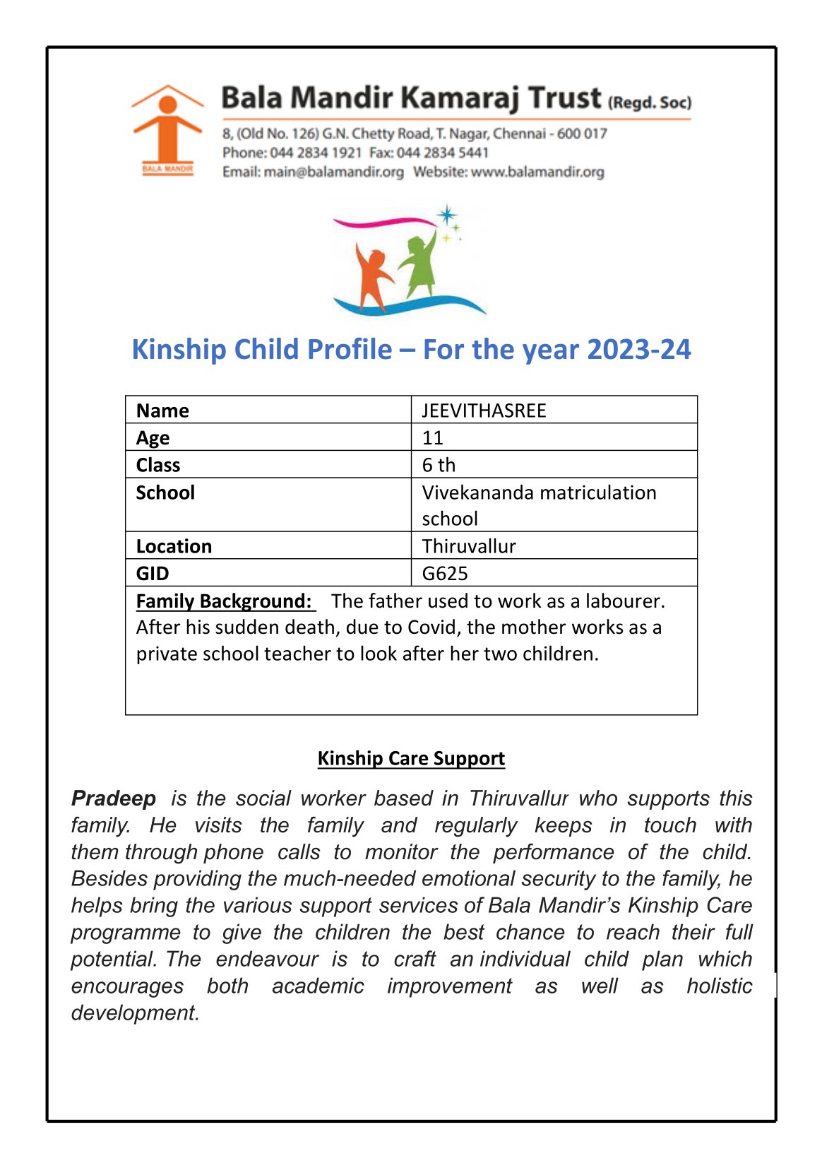 My name is P Natarajan. I am the Trustee and Treasurer of Bala Mandir Kamaraj Trust and we started the Kinship Care program after studying the setbacks faced by the children who suddenly lost one or both of their parents.